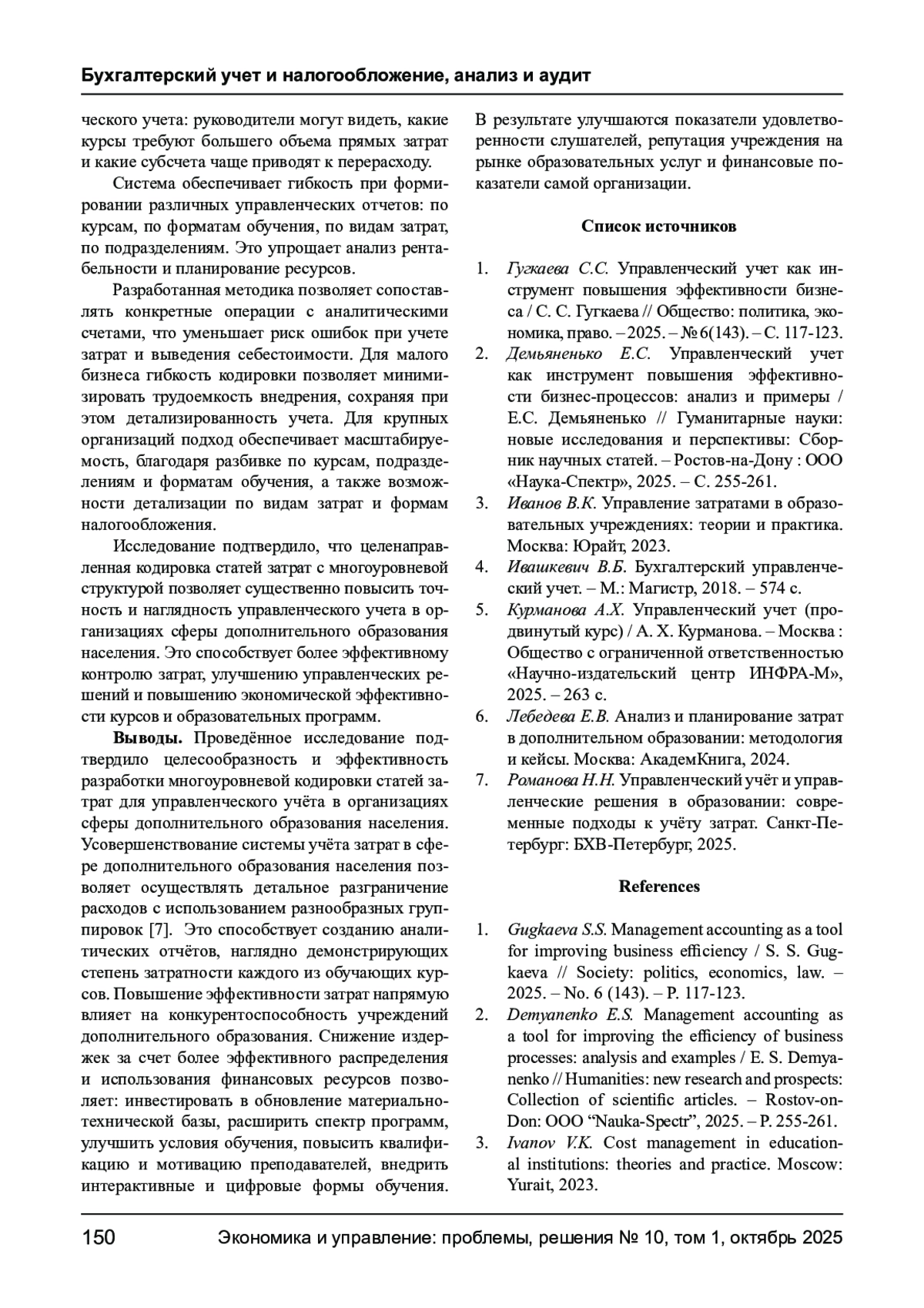 1. Гугкаева С.С. Управленческий учет как инструмент повышения эффективности бизнеса / С. С. Гугкаева // Общество: политика, экономика, право. - 2025. - № 6(143). - С. 117-123. EDN: CENLGB