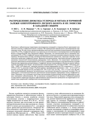 Болотные и заболоченные территории лесопокрытых площадей и открытых болот принимают совместное участие в глобальном цикле углерода. Им принадлежит важная роль в депонировании парниковых газов. В этой статье проанализирована многолетняя динамика концентрации парниковых газов СО2 и СН 4 в торфяной залежи и их эмиссия на естественном и мелиорируемом олиготрофном болоте в южнотаежной зоне Западной Сибири. Показано, что значительная роль в динамике концентрации СО2 и СН 4 в торфяной залежи принадлежит погодным условиям каждого месяца теплого периода, ботаническому составу, активности биохимических процессов, структуре и физико-механическим свойствам торфяной залежи. Выявлена внутризалежная, пространственная и временная динамика показателей концентрации парниковых газов. Доказано, что существуют многокомпонентные зависимости концентрации СО2 и СН 4 от параметров внешних и внутризалежных условий. Определены параметры концентрации в торфяной залежи олиготрофного болота на малом заболоченном водосборе реки Ключ: экстремальные концентрации СО2 составили 0.002–3.64 ммоль/дм 3, СН4 – 0.003–2.03 ммоль/дм3; значения удельных потоков варьировали по СО2 в пределах от /–22.2/ до 157.8 мг С/(м2 ч), удельные потоки СН4 были равны в экстремальных величинах /–3.0/ – 5.3 мг С/(м2 ч), потоки за теплый период по СО 2 составили 20–110 г С/(м 2 год), по СН4 – 0.8–3.7 С/(м2 год). На объекте лесомелиорации выявлено незначительное увеличение активности удельных потоков СO 2 по сравнению с естественным болотом при близких концентрациях парниковых газов в торфяной залежи. Показано, что в условиях отсутствия эксплуатации осушительной системы наблюдается процесс повторного заболачивания. Из-за огромных площадей болот на Западно-Сибирской равнине и агрессивного характера процесса заболачивания предполагается проведение на территории ее таежной зоны умеренной и выборочной лесомелиорации