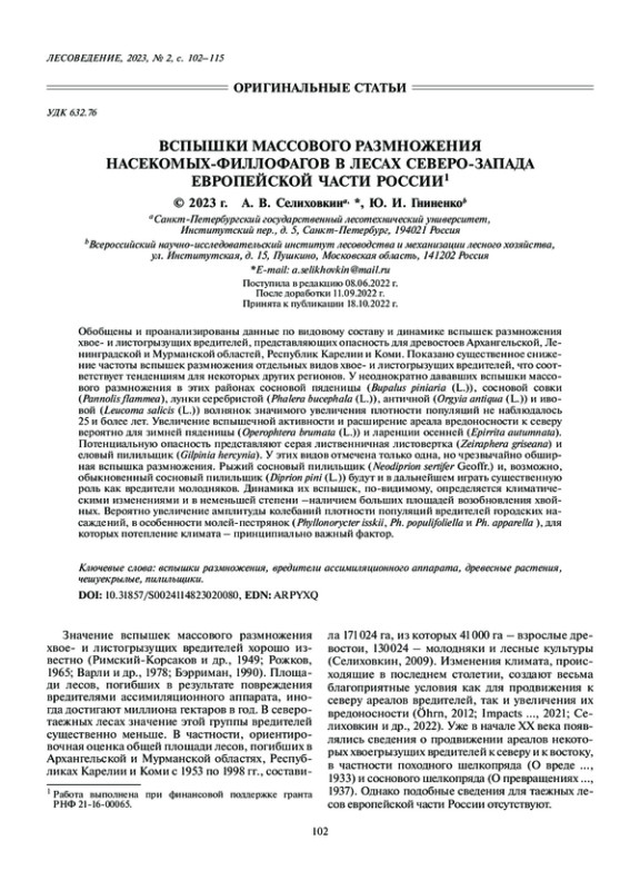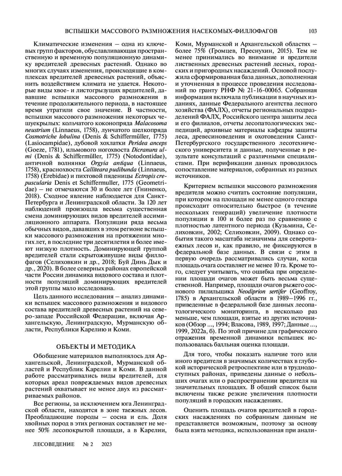 СЕЛИХОВКИН А. В., ГНИНЕНКО Ю. И. ВСПЫШКИ МАССОВОГО РАЗМНОЖЕНИЯ НАСЕКОМЫХ-ФИЛЛОФАГОВ В ЛЕСАХ СЕВЕРО-ЗАПАДА ЕВРОПЕЙСКОЙ ЧАСТИ РОССИИ // ЛЕСОВЕДЕНИЕ. 2023. № 2