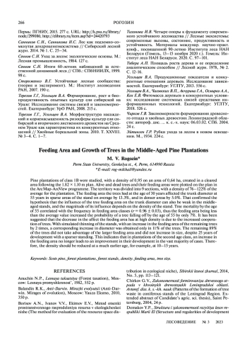 16. Мартынов А.Н. Зависимость биометрических показателей сосны от площади питания // Лесоведение. 1976. № 5. С. 85–88.