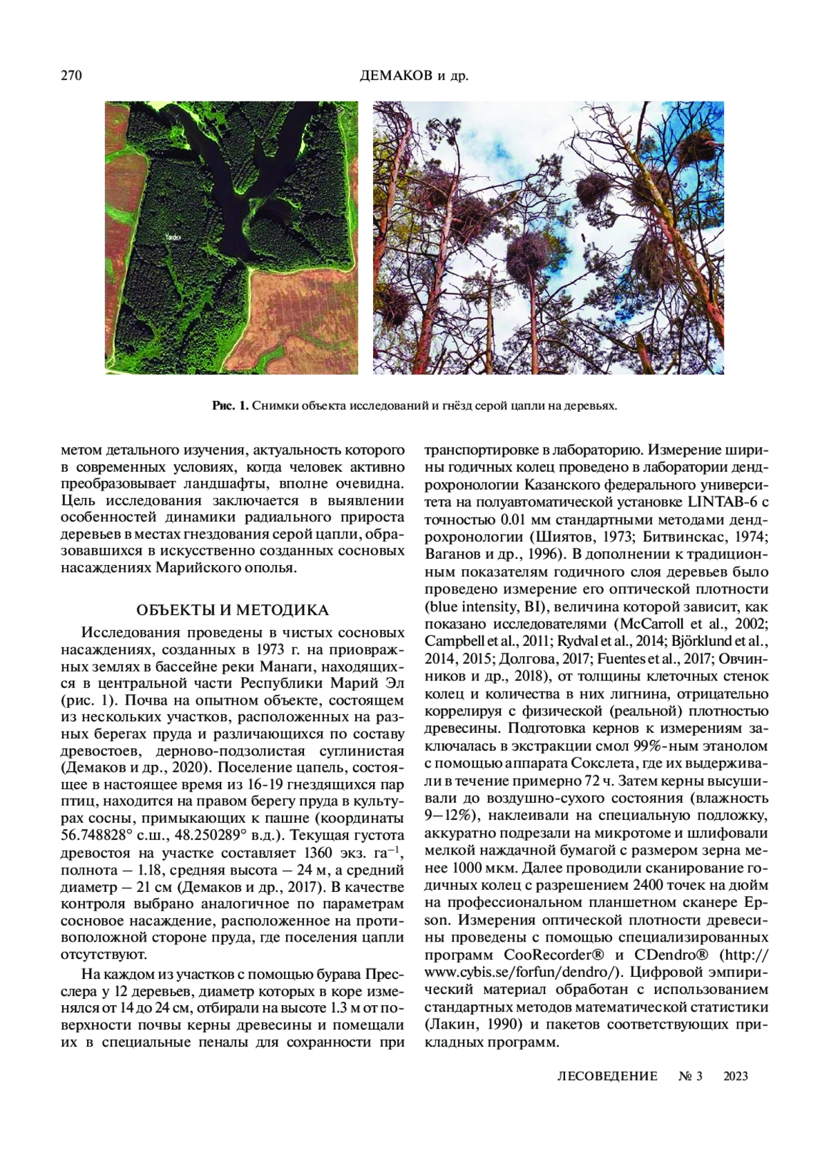 Приведены данные по влиянию колоний серой цапли (Ardea cinerea L., 1758) на динамику параметров годичного кольца деревьев в сосняках искусственного происхождения. Показано, что начало колонизации насаждений серой цаплей можно довольно точно установить при анализе динамики параметров годичных колец деревьев, особенно ширины их позднего слоя и оптической плотности древесины (значения первого из этих параметров в контрольном насаждении ниже, а второго выше). Колонии серой цапли начинают появляться в сосняках уже с 10–12-летнего возраста, когда высота деревьев достигает 5–6 м, а диаметр ствола на высоте 1.3 м от поверхности почвы – всего 7–8 см. В первые 15–20 лет они оказывают положительное влияние на годичный прирост деревьев, особенно на ширину позднего слоя древесины и толщину клеточных стенок, но затем картина меняется на противоположную. Общее время пребывания колоний цапли на одном месте составляет около 35– 40 лет, после чего они переселяются на новые места в связи с расстройством или же полной гибелью насаждений. Для снижения вероятности появления колоний серой цапли, которые во многих случаях оказывают отрицательное влияние на состояние лесных биогеоценозов, необходимо отказаться от создания вблизи водоемов чистых сосняков, отдавая предпочтение еловым, березовым, тополевым или же липово-дубовым насаждениям