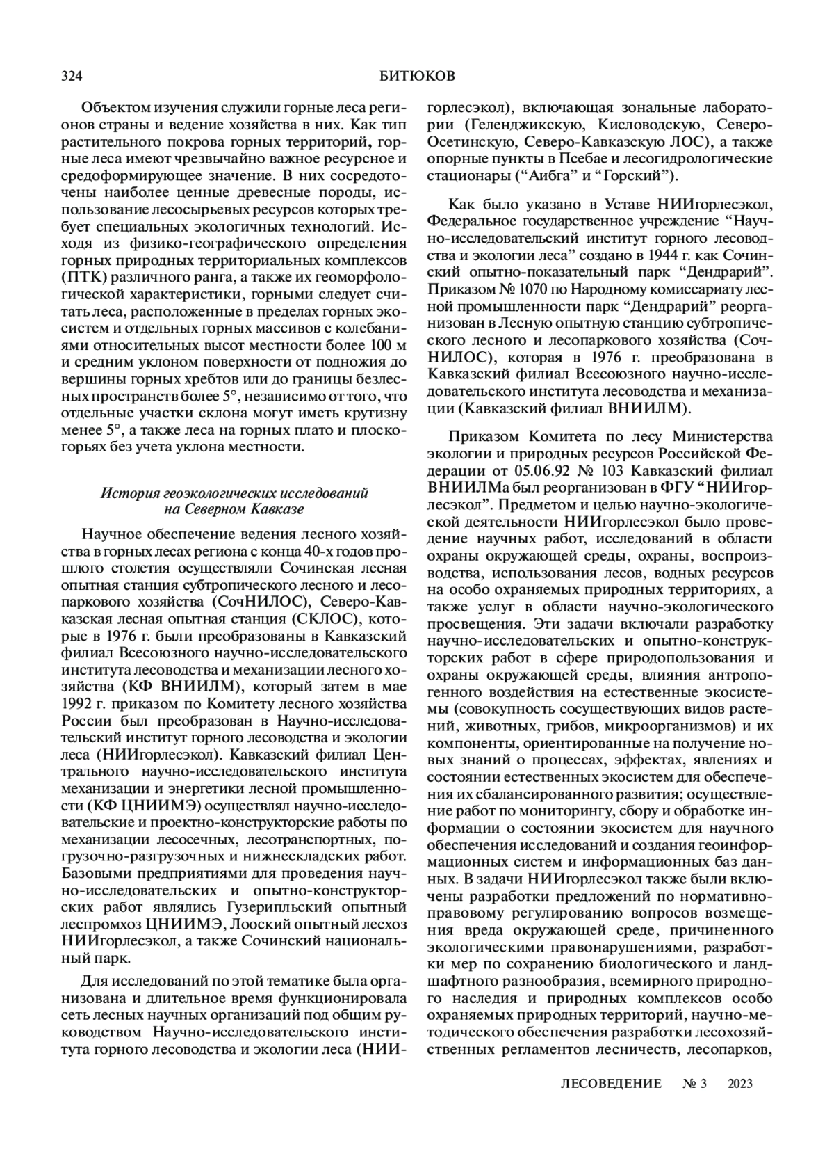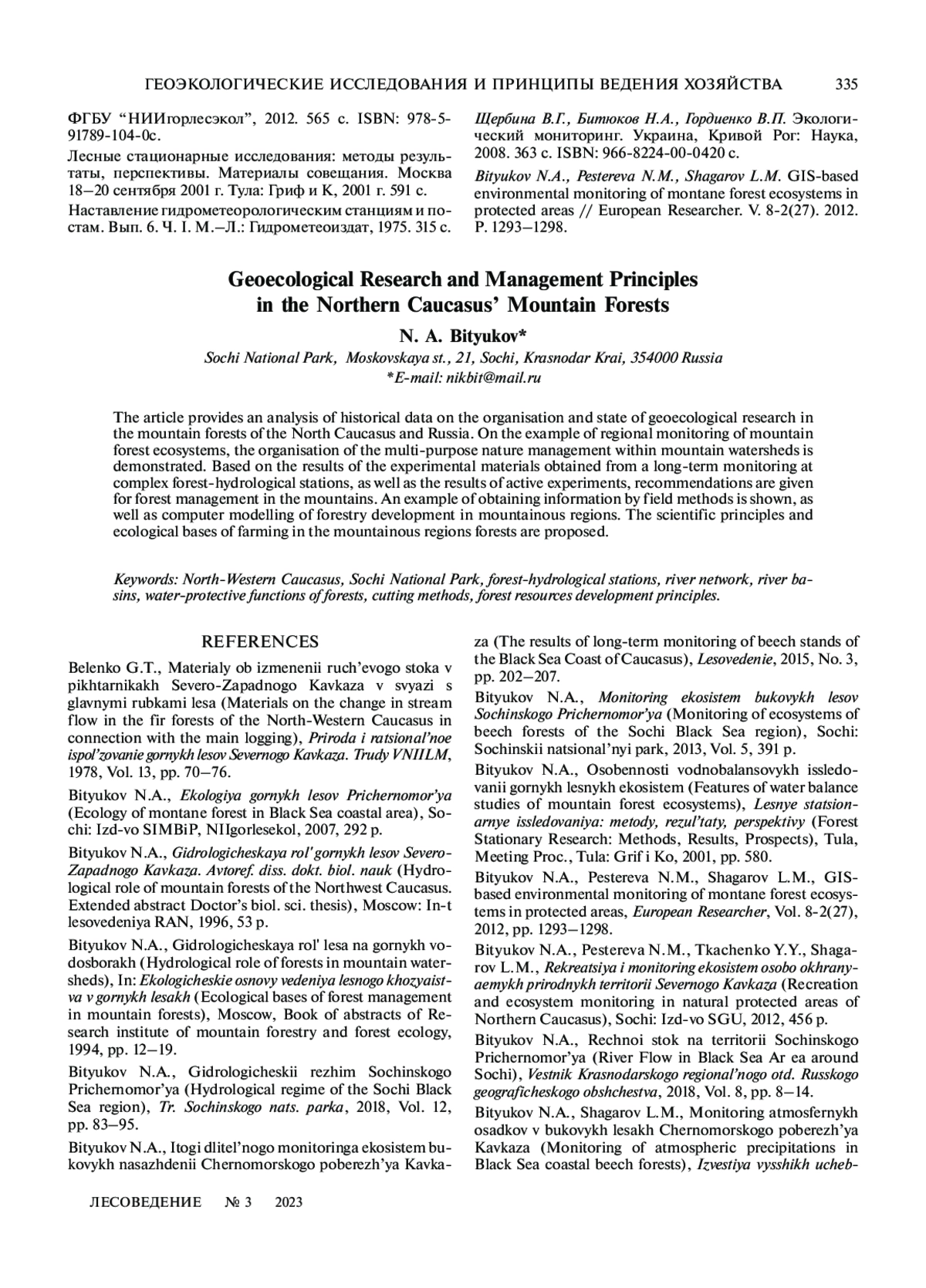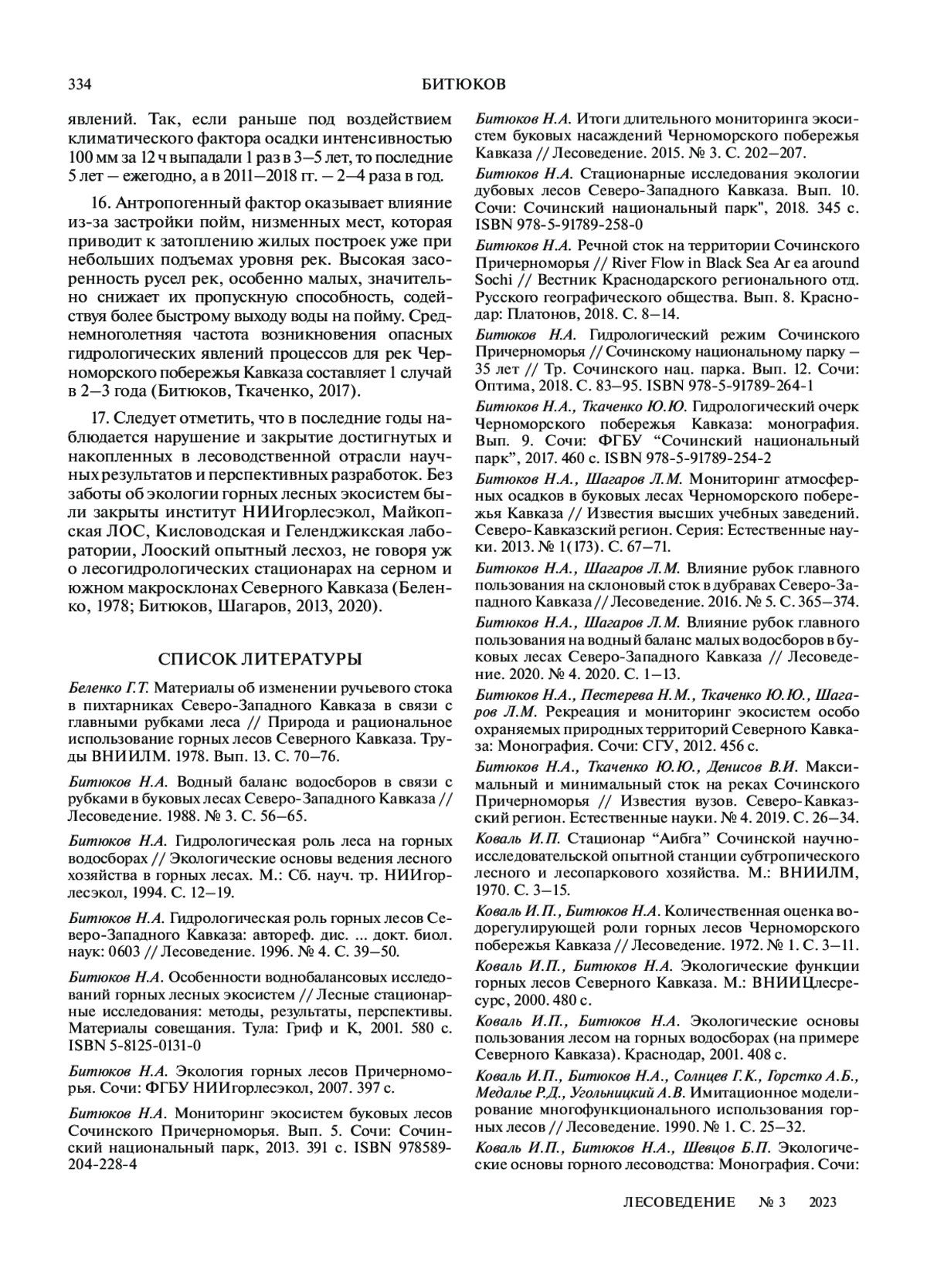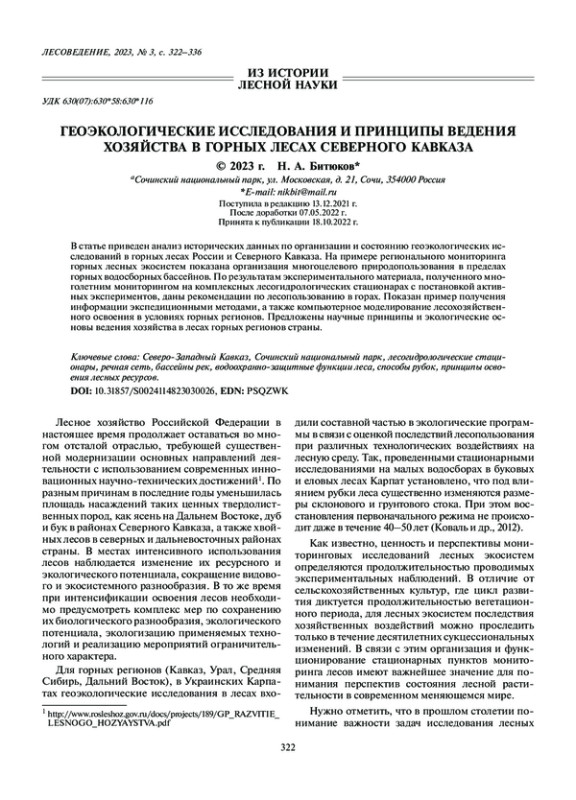 БИТЮКОВ Н. А. ГЕОЭКОЛОГИЧЕСКИЕ ИССЛЕДОВАНИЯ И ПРИНЦИПЫ ВЕДЕНИЯ ХОЗЯЙСТВА В ГОРНЫХ ЛЕСАХ СЕВЕРНОГО КАВКАЗА // ЛЕСОВЕДЕНИЕ. 2023. № 3