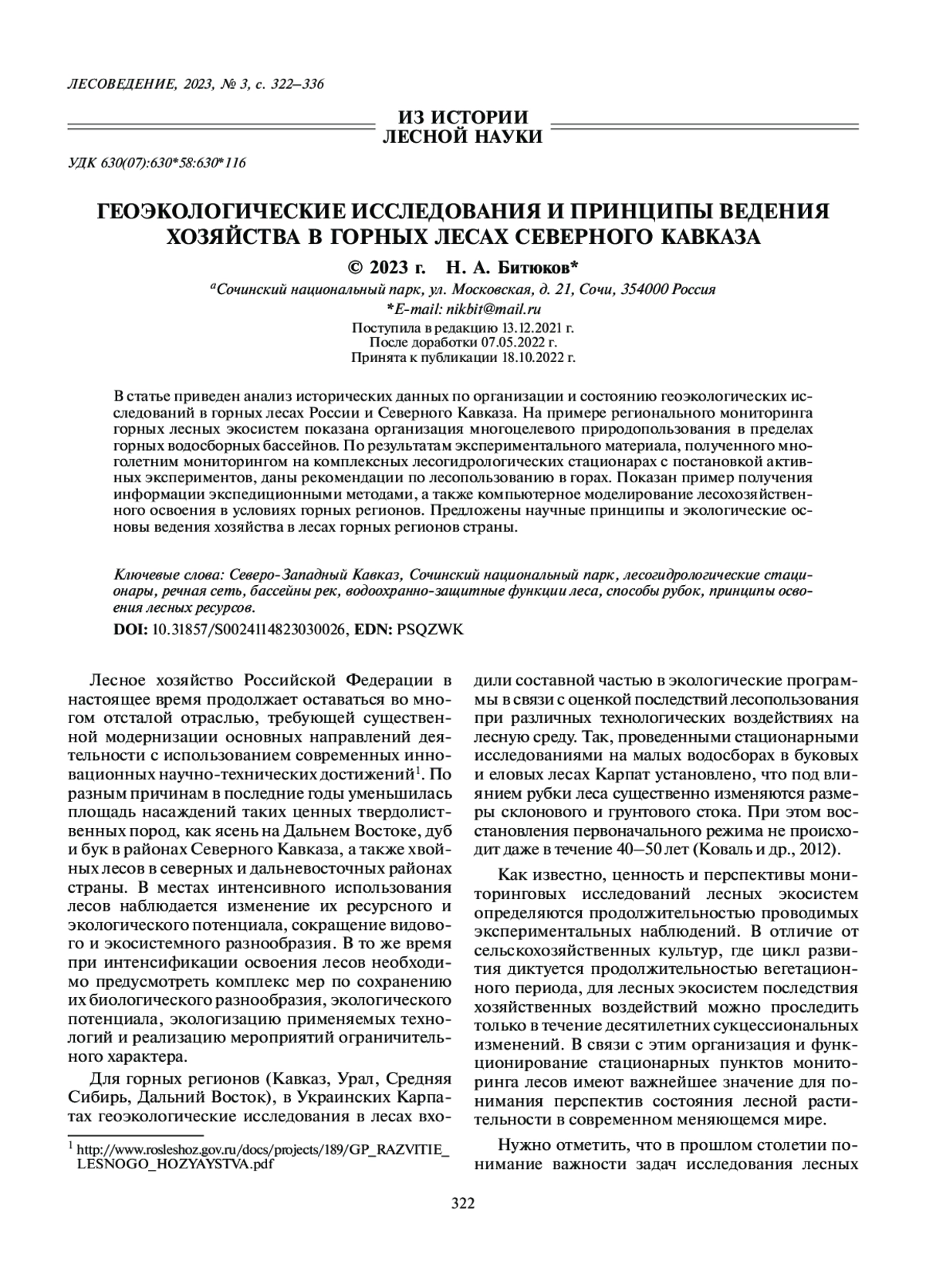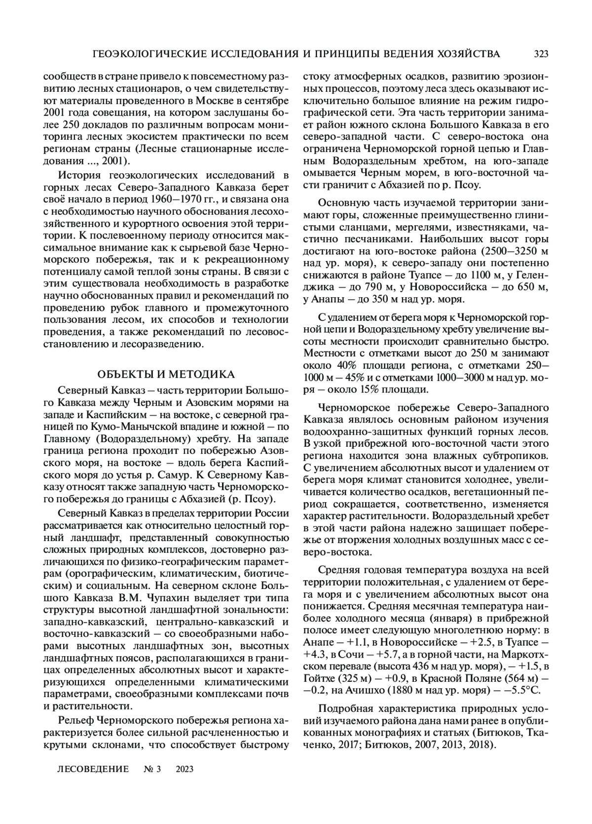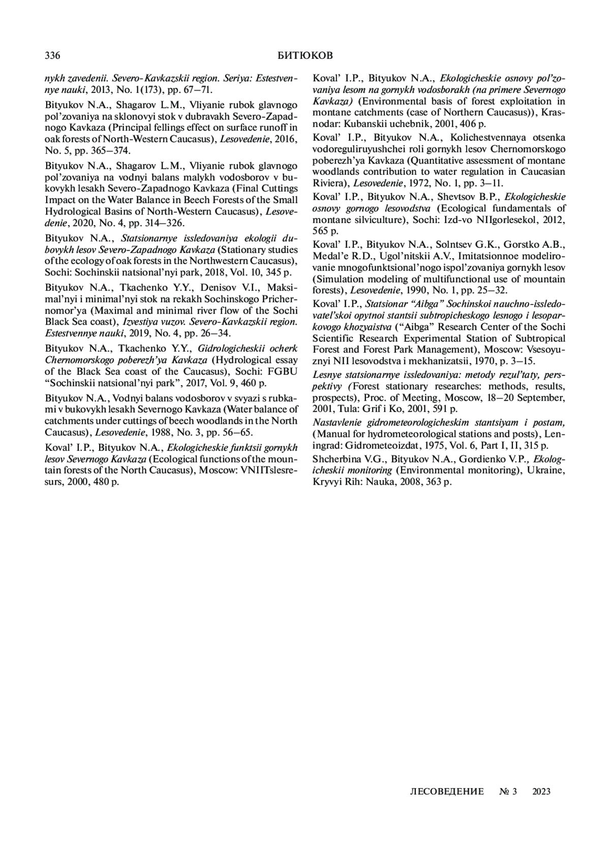 БИТЮКОВ Н. А. ГЕОЭКОЛОГИЧЕСКИЕ ИССЛЕДОВАНИЯ И ПРИНЦИПЫ ВЕДЕНИЯ ХОЗЯЙСТВА В ГОРНЫХ ЛЕСАХ СЕВЕРНОГО КАВКАЗА // ЛЕСОВЕДЕНИЕ. 2023. № 3
