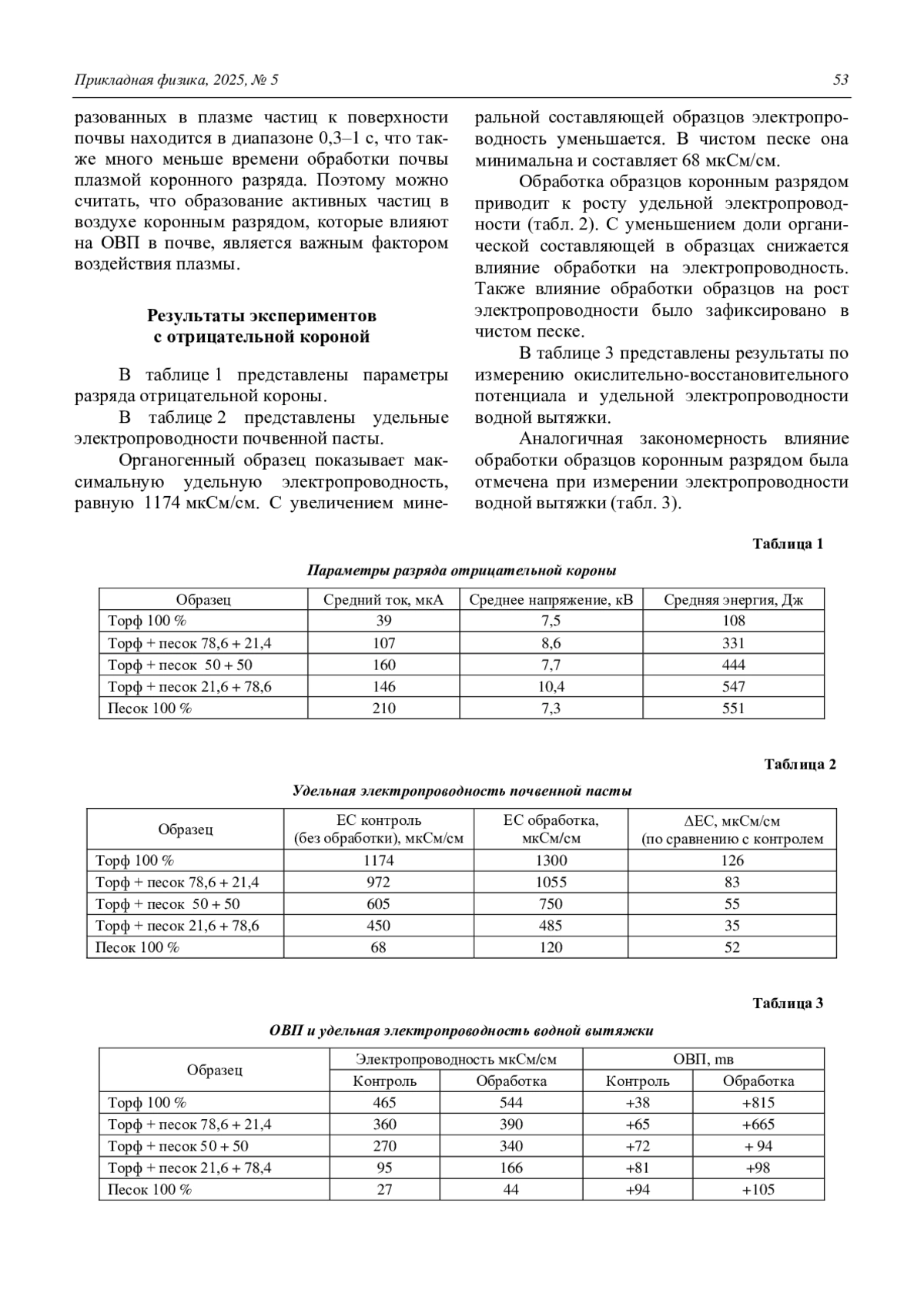 Проведены исследования влияния плазмы коронного разряда на окислительно-восстановительные реакции почвы, а именно на образцы низинного торфа (капилляр-но насыщенного водой) и чистого кварцевого песка (воздушно сухого) в чистом виде и в смесях при разном соотношении торфа и песка. Параметры разряда: время действия до 60 мин, напряжение на разряде U = 10–20 кВ, ток в разряде I = 20–100 мкА. Максимальный эффект обработки коронным разрядом образцов был получен в отношении окислительно-восстановительного потенциала. Процесс окисления органического вещества идет под влиянием озона и отрицательных ионов, образующихся в плазме коронного разряда. Эффективность воздействия отрицательной короны в 2–5 раз выше, чем положительной, что связано с более эффективной наработкой отрицательных ионов.
