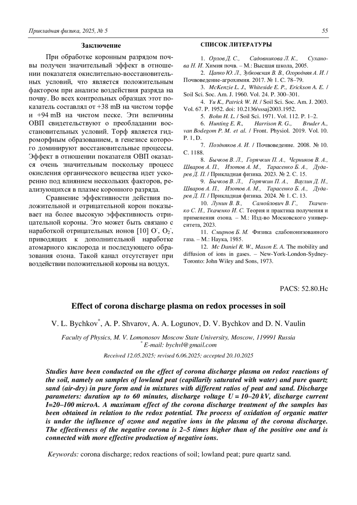 Воздействие плазмы коронного разряда на окислительно-восстановительные процессы в почве