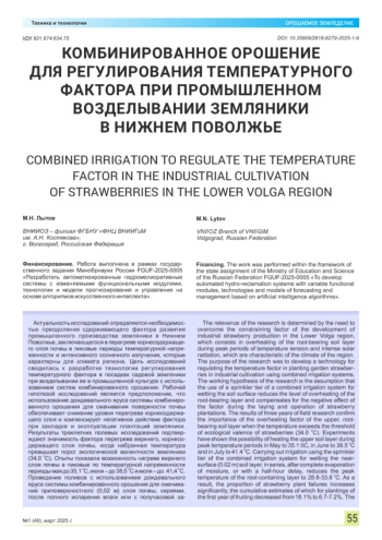 Актуальность исследований определяется необходимостью преодоления сдерживающего фактора развития промышленного производства земляники в Нижнем Поволжье, заключающегося в перегреве корнесодержащего слоя почвы в пиковые периоды температурной напряженности и интенсивного солнечного излучения, которые характерны для климата региона. Цель исследований сводилась к разработке технологии регулирования температурного фактора в посадках садовой земляники при возделывании ее в промышленной культуре с использованием систем комбинированного орошения. Рабочей гипотезой исследований является предположение, что использование дождевального яруса системы комбинированного орошения для смачивания поверхности почвы обеспечивает снижение уровня перегрева корнесодержащего слоя и компенсирует негативное действие фактора при закладке и эксплуатации плантаций земляники. Результаты трехлетних полевых исследований подтверждают значимость фактора перегрева верхнего, корнесодержащего слоя почвы, когда набранная температура превышает порог экологической валентности земляники (34,0 0С). Опыты показали возможность нагрева верхнего слоя почвы в пиковые по температурной напряженности периоды мая до 35,1 0С, июня – до 38,5 0С и июля – до 41,4 0С. Проведение поливов с использованием дождевального яруса системы комбинированного орошения для смачивания приповерхностного (0,02 м) слоя почвы, сериями, после полного испарения влаги или с получасовой задержкой, снижает пиковую температуру корнесодержащего слоя до 28,8-33,8 0С. В результате статистически значимо сокращается доля выпадов растений земляники, кумулятивные оценки которых для посадок первого года плодоношения снижались с 18,1 % до 6,7-7,2 %. Урожайность в посадках земляники первого года плодоношения возрастала с 18,1 т/га (на контроле) до 22,2- 22,5 т/га.