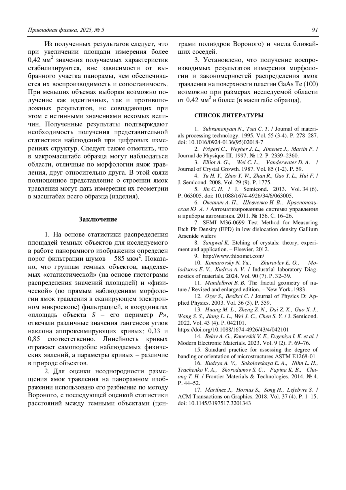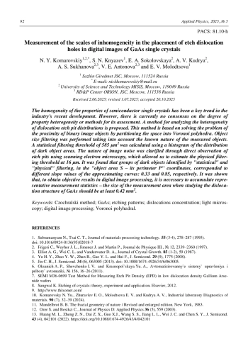 Однородность свойств полупроводниковых монокристаллов является одним из главных трендом развития отросли в последнее время. Однако на данный момент не существует единого представления о мере неоднородности свойств и методах ее оценки. Предложен метод анализа неоднородности размещения дислокационных ямок травления на основе решения задачи о близости объектов бинарного изображения разбиением пространства на полиэдры Вороного. Фильтрацию объектов по размерам проводили с учетом известной природы объектов измерения. На основе гистограммы распределения площадей темных объектов был рассчитан «статистический» порог фильтрации, величина которого составила 585 мкм2. Уточнение природы шумов на изображении проводилось на основе прямого наблюдения ямок травления методами сканирующей электронной микроскопии, что позволило оценить величину «физического» порога фильтрации – 16 мкм2. Установлено, что группам темных объектов, выделяемых «статистической» и «физической» фильтрацией, в координатах «площадь объекта S – его периметр P» отвечали различные значения тангенсов углов наклона аппроксимирующих кривых: 0,33 и 0,85 соответственно. Показано, что для получения объективных результатов при цифровой обработке изображений необходимо накопление представительной статистики измерений. Так, для исследуемого в работе панорамного изображения ямок травления в GaAs размер площади измерений должен быть не менее 0,42 мм2.