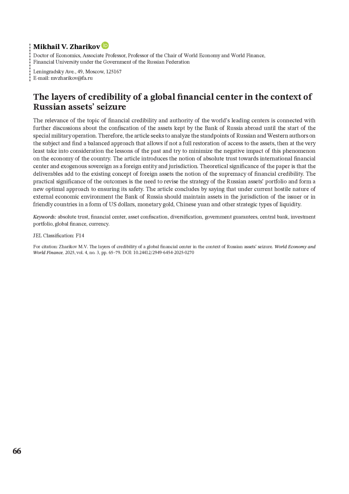 13. Кузнецов А.В. Фрагментация мировой валютно-финансовой системы в условиях роста геополитической напряженности // Вестник Российского университета дружбы народов. Серия: Международные отношения. 2025. Т. 25. № 1. С. 56-66. DOI: 10.22363/2313-0660-2025-25-1-56-66