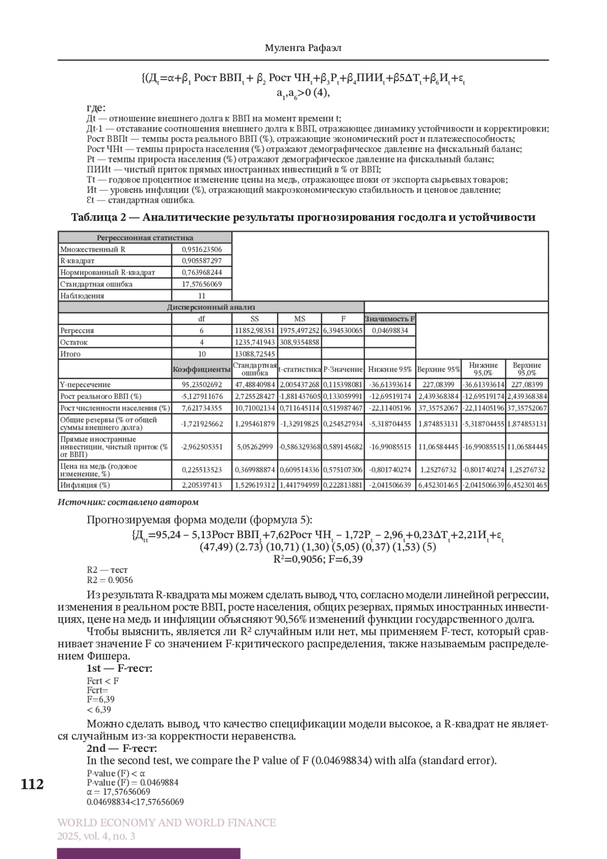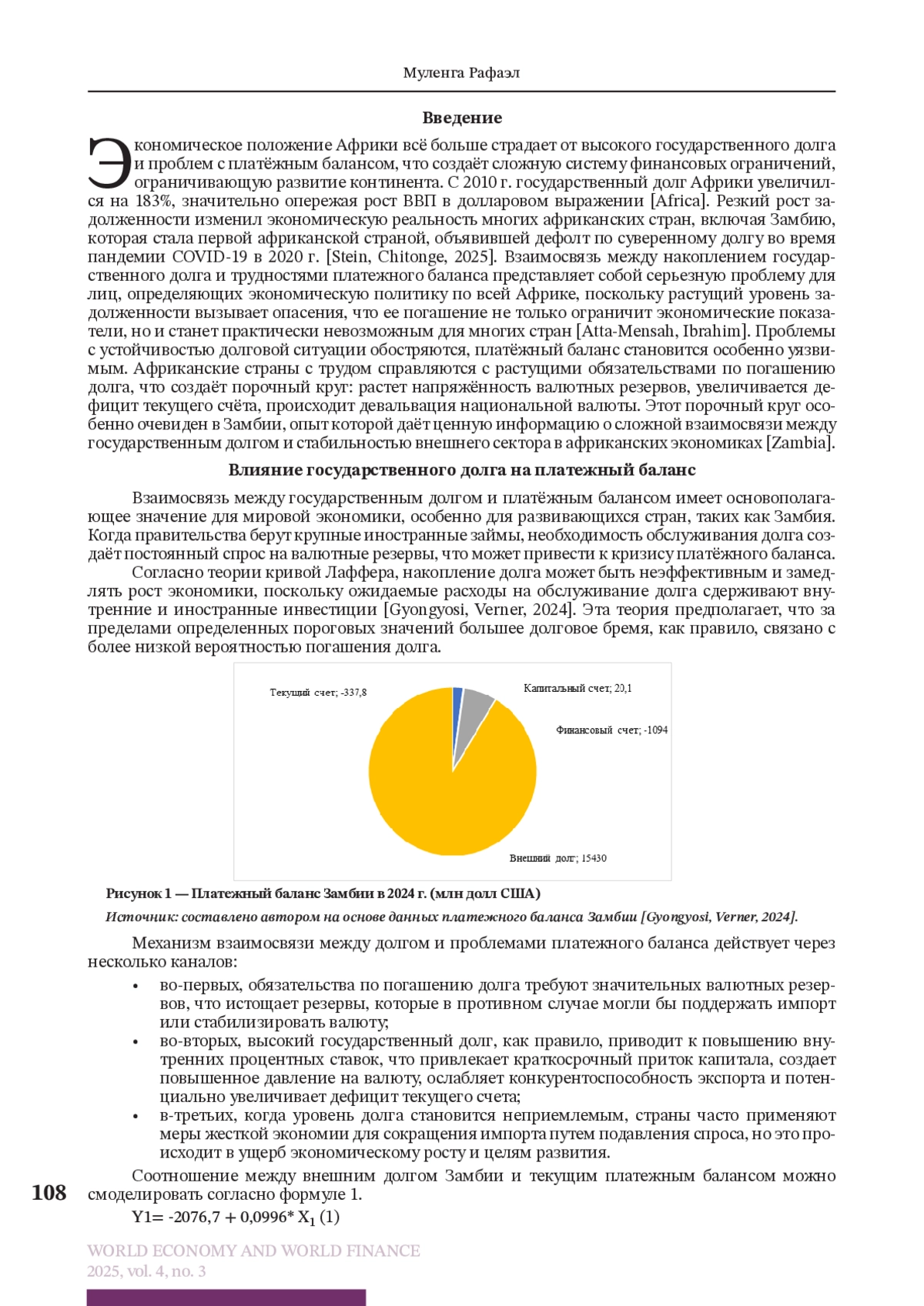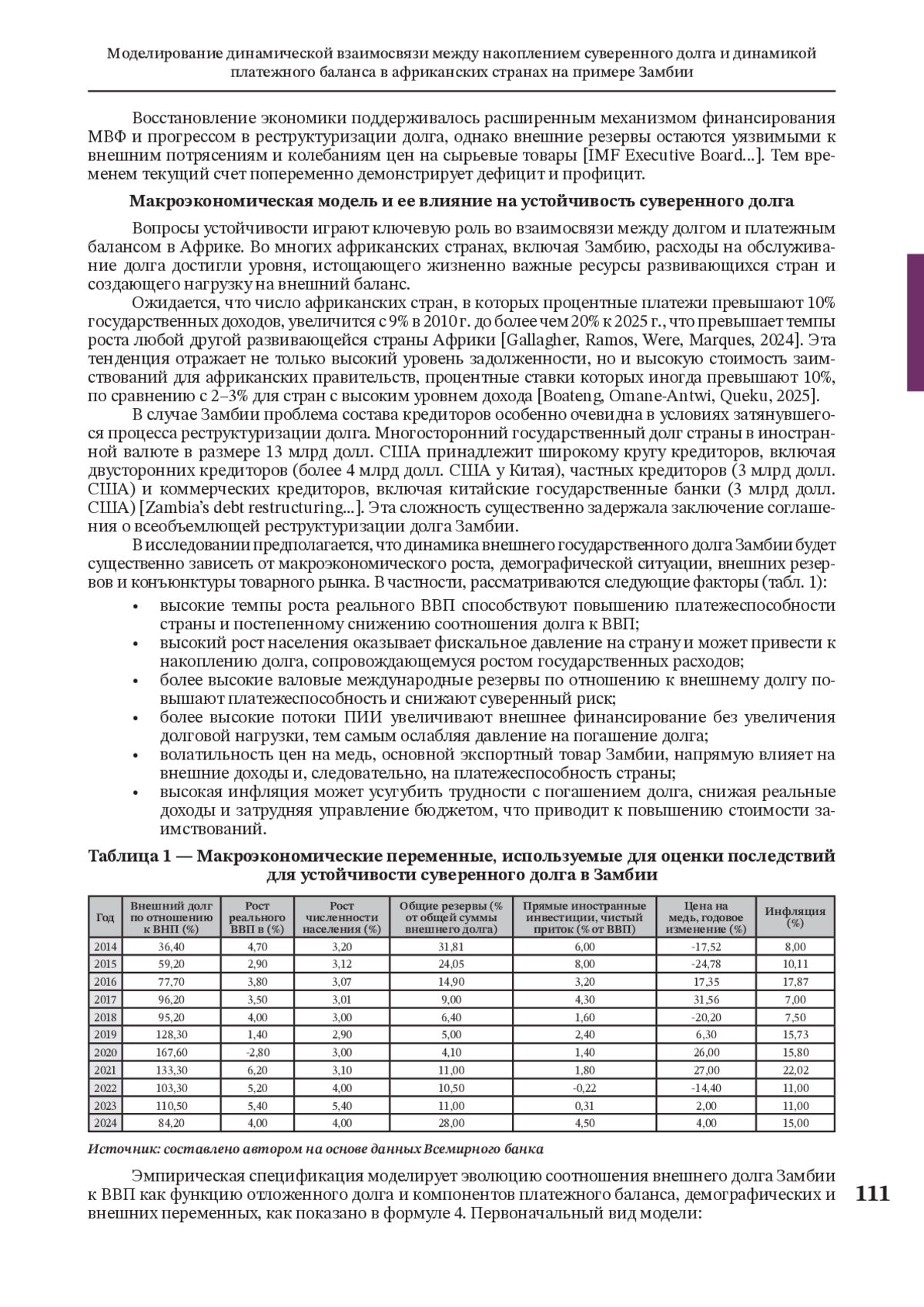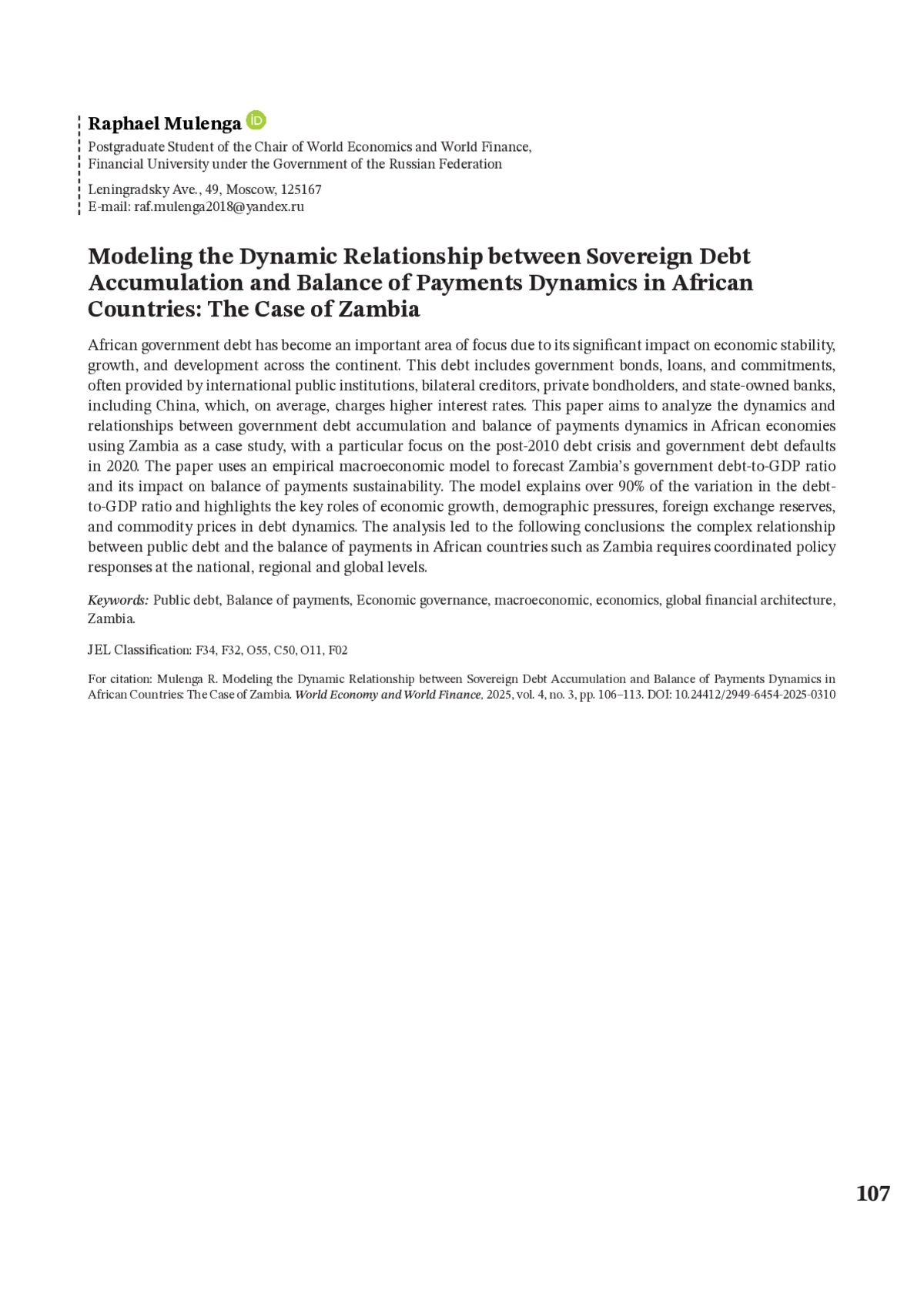 МУЛЕНГА Р. МОДЕЛИРОВАНИЕ ДИНАМИЧЕСКОЙ ВЗАИМОСВЯЗИ МЕЖДУ НАКОПЛЕНИЕМ СУВЕРЕННОГО ДОЛГА И ДИНАМИКОЙ ПЛАТЕЖНОГО БАЛАНСА В АФРИКАНСКИХ СТРАНАХ НА ПРИМЕРЕ ЗАМБИИ // МИРОВАЯ ЭКОНОМИКА И МИРОВЫЕ ФИНАНСЫ. 2025. № 3, ТОМ 4