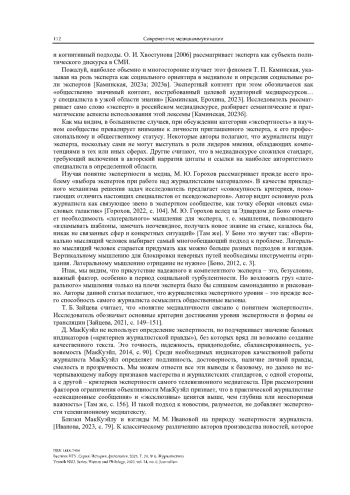 4. Иванова М. М. Экспертность как качество современного медиаспециалиста // INTERLINGUA-2023: Сб. науч. тр. III Междунар. науч.-практ. конф. Липецк, 2023. С. 79-87.