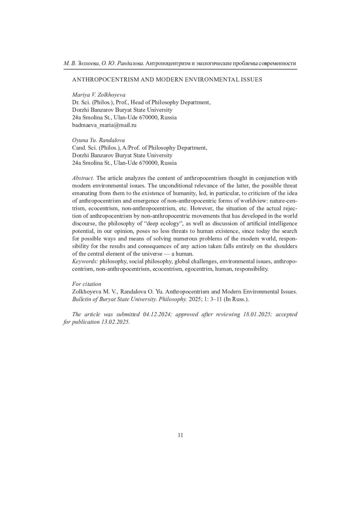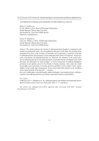 БАДМАЕВА М. В., РАНДАЛОВА О. Ю. АНТРОПОЦЕНТРИЗМ И ЭКОЛОГИЧЕСКИЕ ПРОБЛЕМЫ СОВРЕМЕННОСТИ // ВЕСТНИК БУРЯТСКОГО ГОСУДАРСТВЕННОГО УНИВЕРСИТЕТА. 2025. № 1