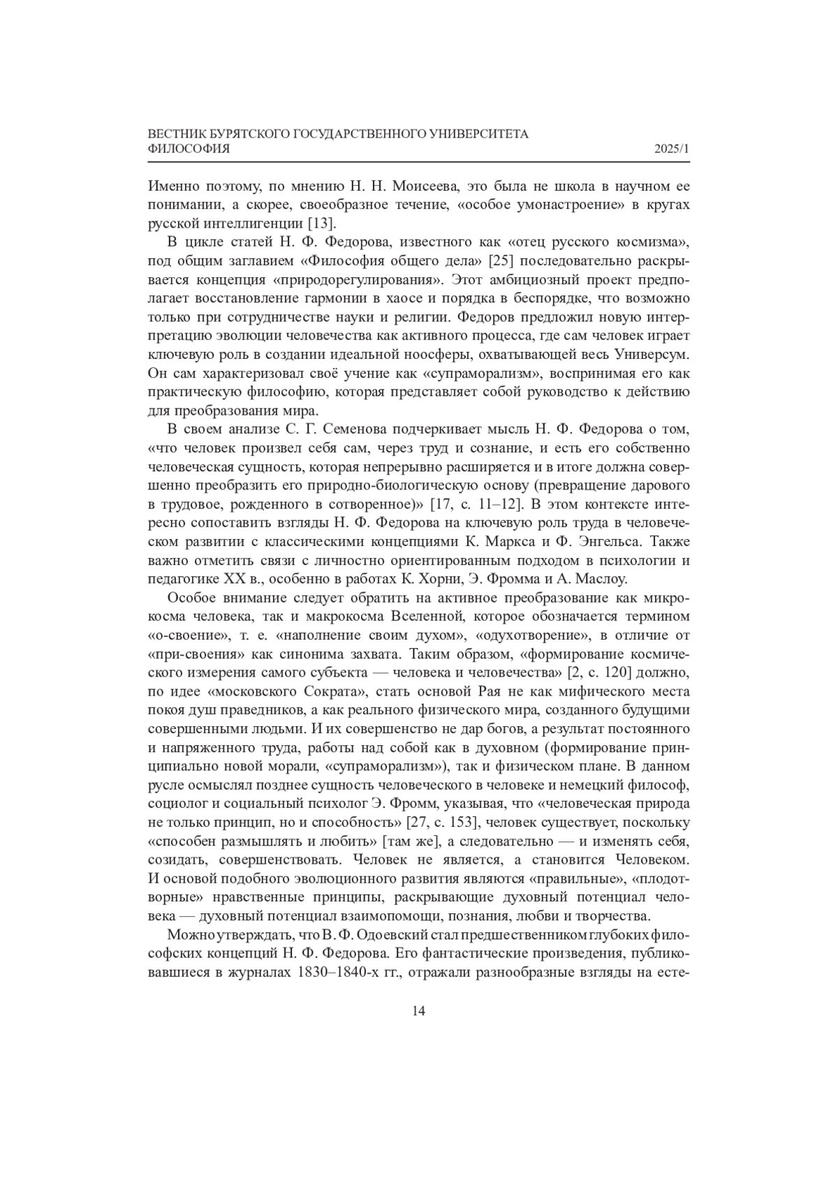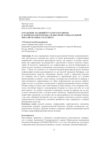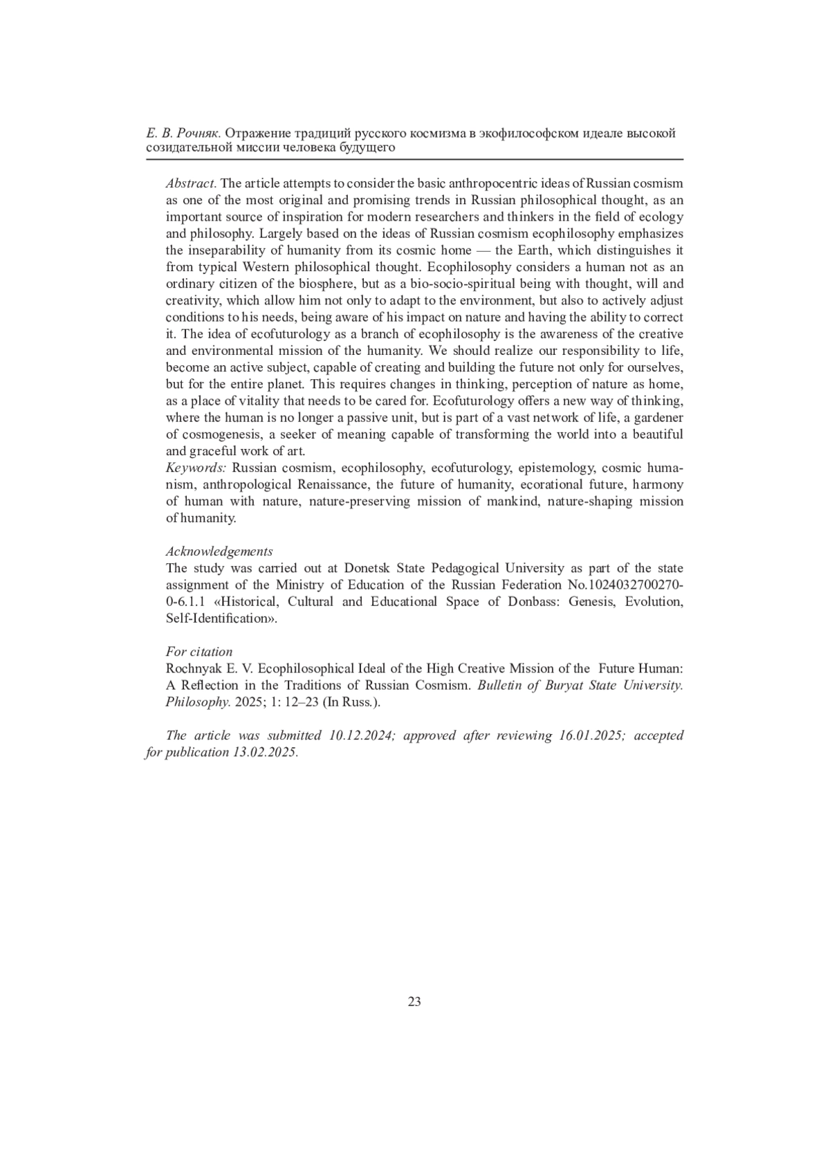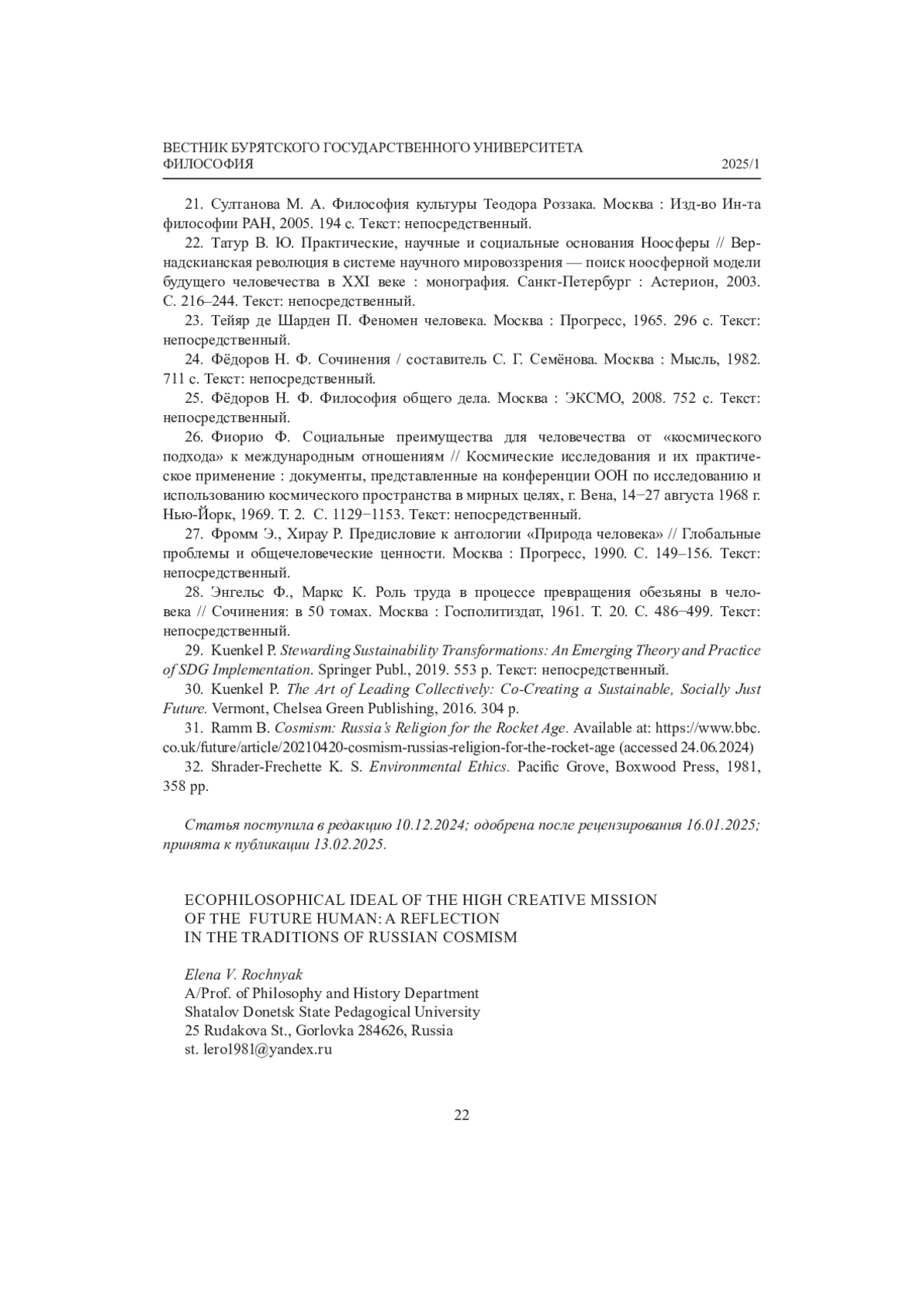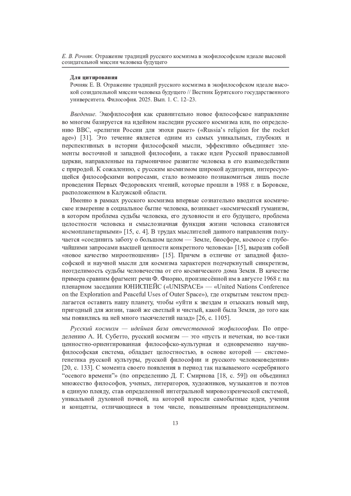РОЧНЯК Е. В. ОТРАЖЕНИЕ ТРАДИЦИЙ РУССКОГО КОСМИЗМА В ЭКОФИЛОСОФСКОМ ИДЕАЛЕ ВЫСОКОЙ СОЗИДАТЕЛЬНОЙ МИССИИ ЧЕЛОВЕКА БУДУЩЕГО // ВЕСТНИК БУРЯТСКОГО ГОСУДАРСТВЕННОГО УНИВЕРСИТЕТА. 2025. № 1