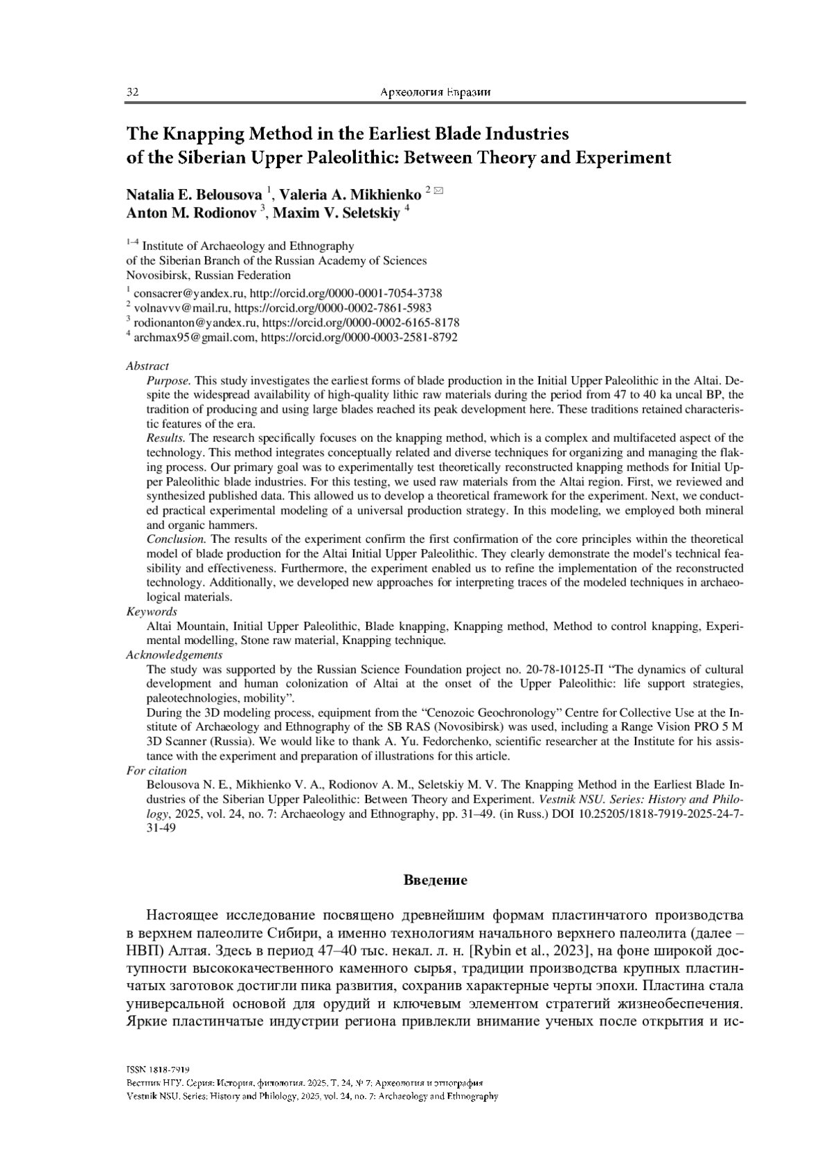 Исследование посвящено древнейшим формам пластинчатого производства в начальном верхнем палеолите Алтая. В период ок. 47–40 тыс. л. н. (некал.) на фоне широкой доступности высококачественного каменного сырья традиции производства и использования крупных пластинчатых заготовок здесь достигли пика развития, сохранив характерные приметы эпохи. Предметом изучения выступил метод расщепления. Цель работы – экспериментальная апробация на алтайском сырье методов расщепления, теоретически реконструированных для пластинчатых индустрий начального верхнего палеолита региона. Для этого на основе обобщения опубликованных данных была сформулирована теоретическая база эксперимента и проведено экспериментальное моделирование одной из ключевых производственных стратегий с использованием минеральных и органических отбойников. Результаты работы впервые подтвердили ключевые положения теоретической модели производства пластин в начальном верхнем палеолите Алтая, доказав ее техническую осуществимость и эффективность. Были уточнены отдельные аспекты практической реализации реконструированной технологии и сформулированы новые подходы к интерпретации следов моделируемых приемов в археологическом материале.