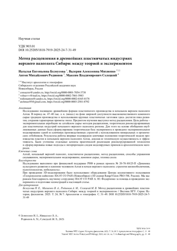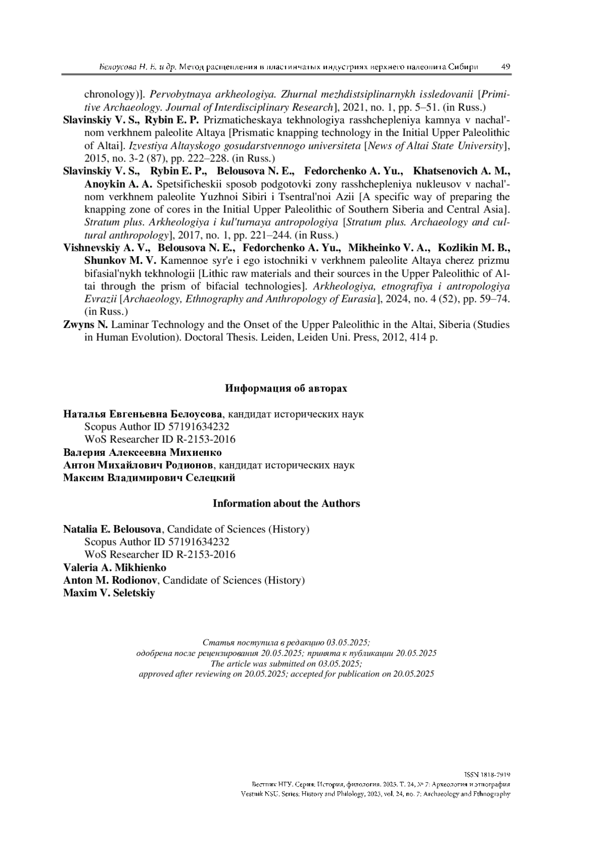 3. Белоусова Н. Е., Родионов А. М., Вишневский А. В., Федорченко А. Ю., Михиенко В. А., Селецкий М. В. «Тонкие» листовидные бифасы начала верхнего палеолита Алтая: технология, формообразование и каменное сырье // Stratum plus. Археология и культурная антропология. 2022. № 1. С. 329-353.