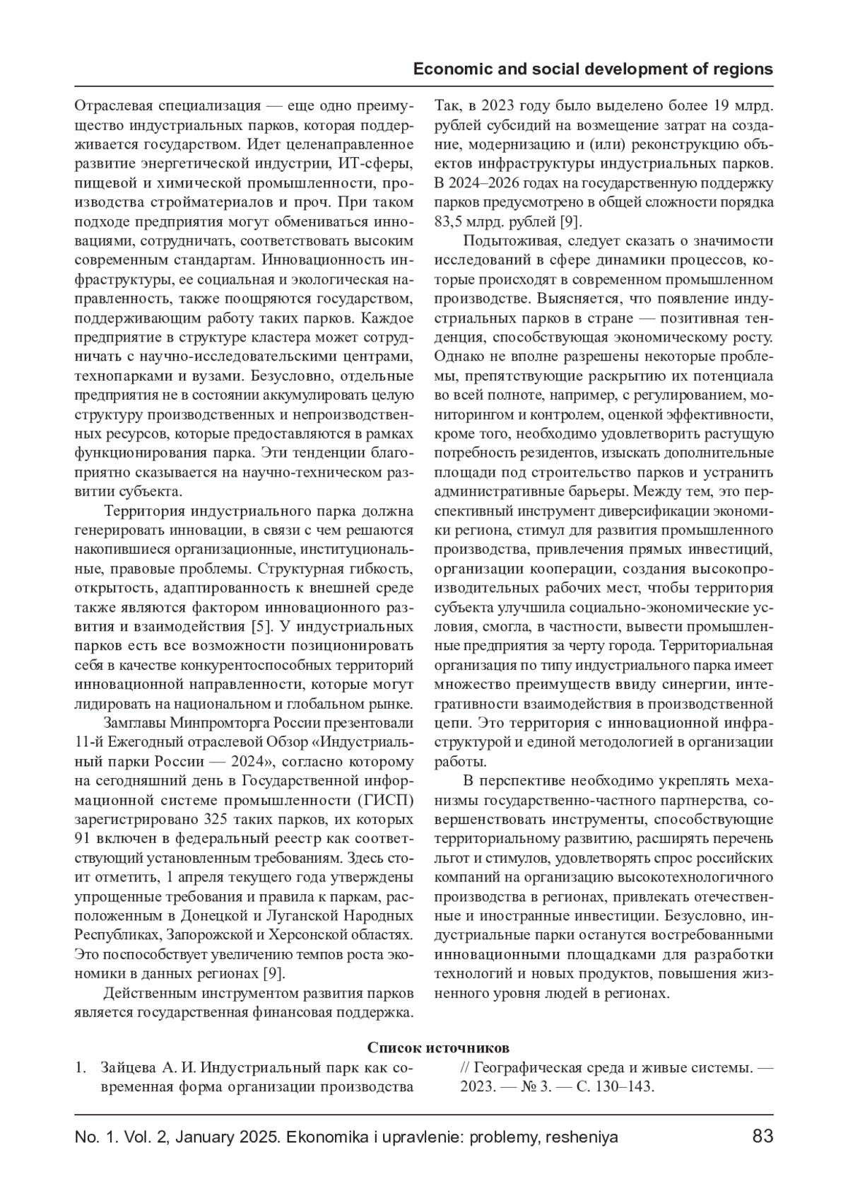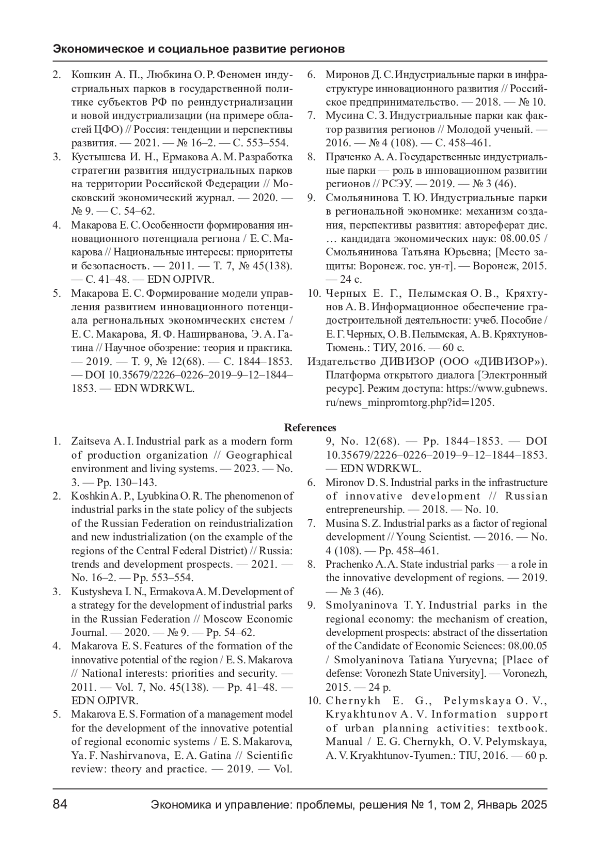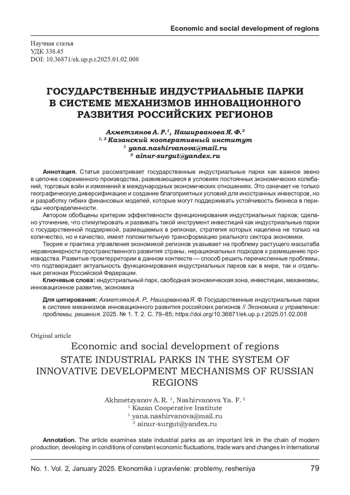 АХМЕТЗЯНОВ А. Р., НАШИРВАНОВА Я. Ф. ГОСУДАРСТВЕННЫЕ ИНДУСТРИАЛЬНЫЕ ПАРКИ В СИСТЕМЕ МЕХАНИЗМОВ ИННОВАЦИОННОГО РАЗВИТИЯ РОССИЙСКИХ РЕГИОНОВ // ЭКОНОМИКА И УПРАВЛЕНИЕ: ПРОБЛЕМЫ, РЕШЕНИЯ. 2025. ТОМ 2 № 1