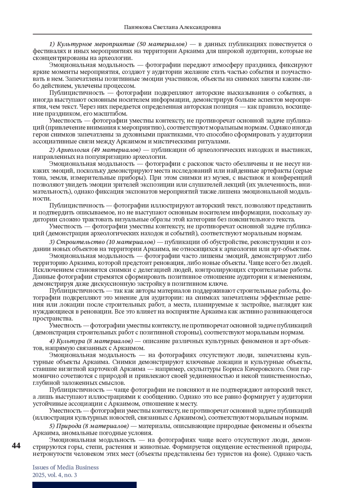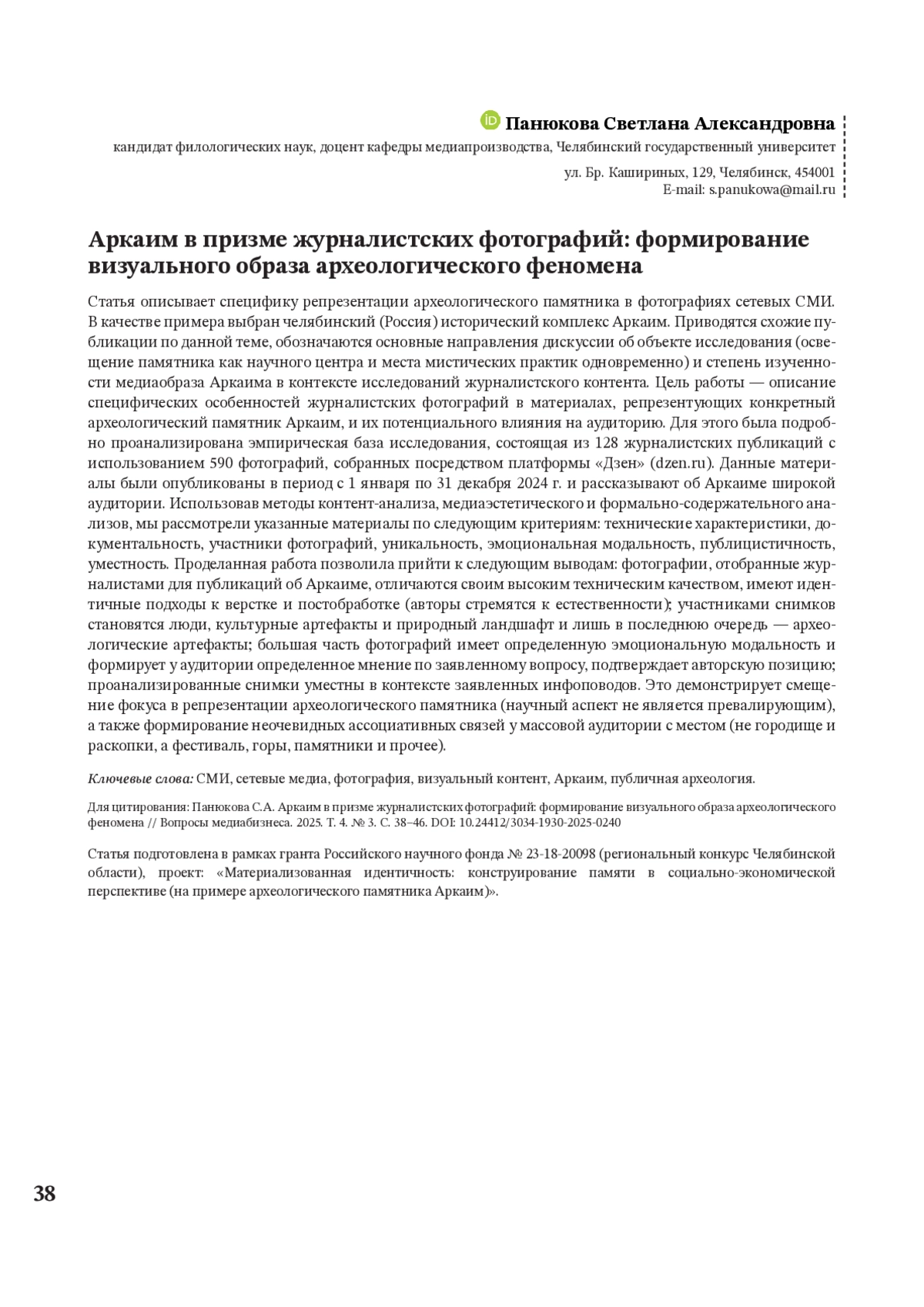 Статья описывает специфику репрезентации археологического памятника в фотографиях сетевых СМИ. В качестве примера выбран челябинский (Россия) исторический комплекс Аркаим. Приводятся схожие публикации по данной теме, обозначаются основные направления дискуссии об объекте исследования (освещение памятника как научного центра и места мистических практик одновременно) и степень изученности медиаобраза Аркаима в контексте исследований журналистского контента. Цель работы — описание специфических особенностей журналистских фотографий в материалах, репрезентующих конкретный археологический памятник Аркаим, и их потенциального влияния на аудиторию. Для этого была подробно проанализирована эмпирическая база исследования, состоящая из 128 журналистских публикаций с использованием 590 фотографий, собранных посредством платформы «Дзен» (dzen. ru). Данные материалы были опубликованы в период с 1 января по 31 декабря 2024 г. и рассказывают об Аркаиме широкой аудитории. Использовав методы контент-анализа, медиаэстетического и формально-содержательного анализов, мы рассмотрели указанные материалы по следующим критериям: технические характеристики, документальность, участники фотографий, уникальность, эмоциональная модальность, публицистичность, уместность. Проделанная работа позволила прийти к следующим выводам: фотографии, отобранные журналистами для публикаций об Аркаиме, отличаются своим высоким техническим качеством, имеют идентичные подходы к верстке и постобработке (авторы стремятся к естественности); участниками снимков становятся люди, культурные артефакты и природный ландшафт и лишь в последнюю очередь — археологические артефакты; большая часть фотографий имеет определенную эмоциональную модальность и формирует у аудитории определенное мнение по заявленному вопросу, подтверждает авторскую позицию; проанализированные снимки уместны в контексте заявленных инфоповодов. Это демонстрирует смещение фокуса в репрезентации археологического памятника (научный аспект не является превалирующим), а также формирование неочевидных ассоциативных связей у массовой аудитории с местом (не городище и раскопки, а фестиваль, горы, памятники и прочее).
