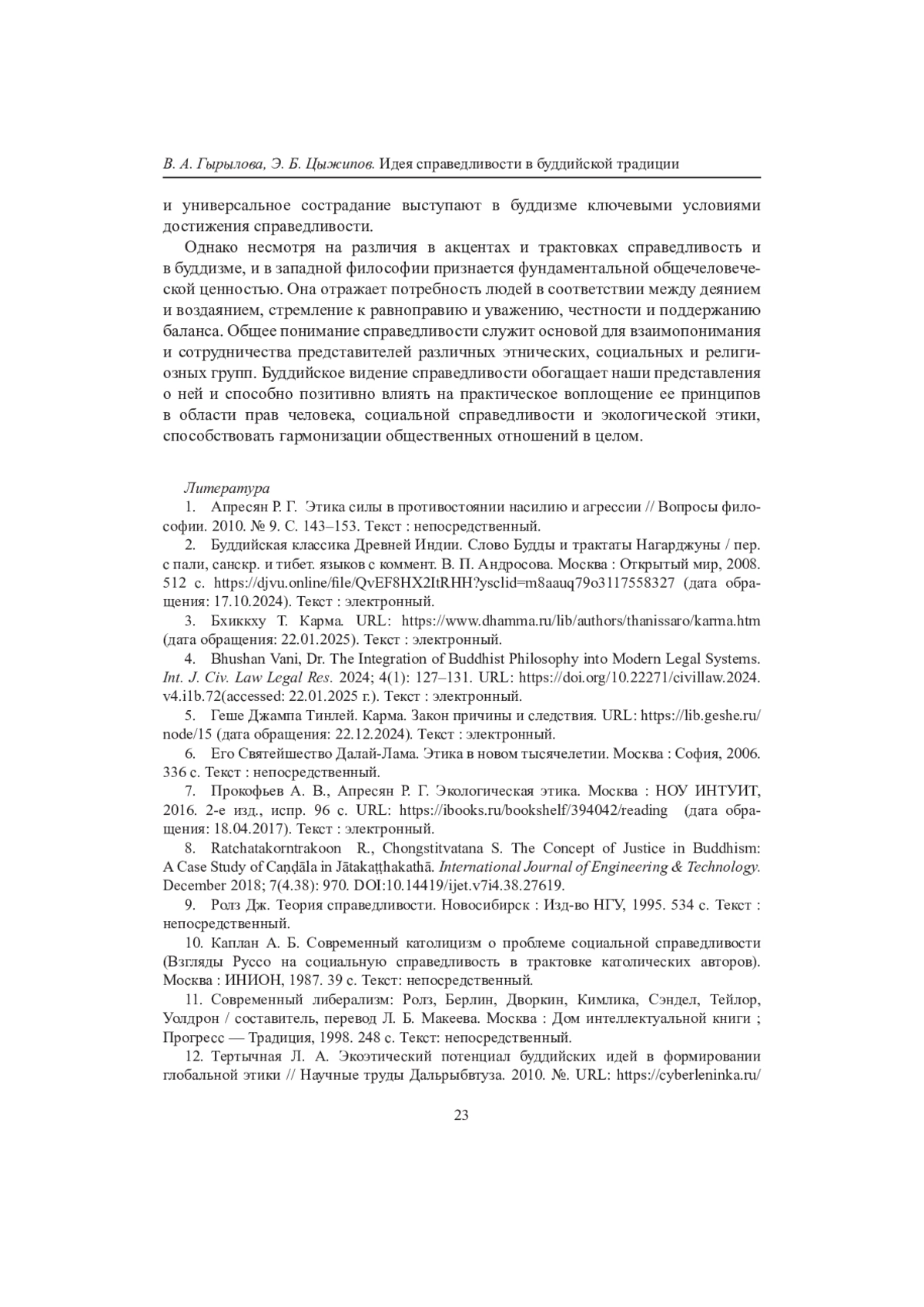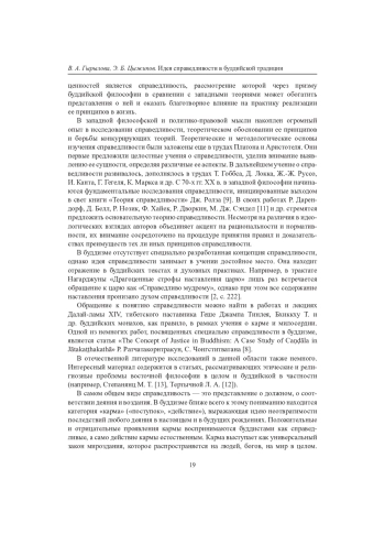 На фоне современных политических, социально-экономических и экологических катаклизмов проблема общечеловеческих ценностей приобретает особую актуальность. Признание существования универсалий делает возможным конст- руктивный диалог и сотрудничество людей. В этом контексте особый интерес представляют исследования, направленные на выявление не только культурно специфичных, но и универсально значимых интерпретаций фундаментальных ценностей в разных культурных традициях. Одной из важнейших духовно-нравственных ценностей является справедливость, рассмотрение которой через призму буддийской философии в сравнении с западными теориями может обогатить представления о ней и оказать благотворное влияние на практику реализации ее принципов в жизнь.