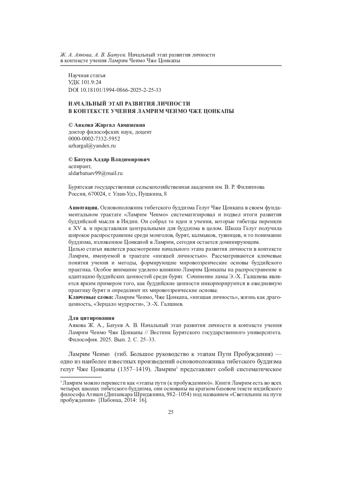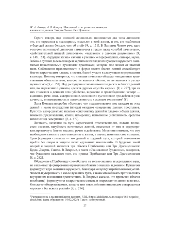 Основоположник тибетского буддизма Гелуг Чже Цонкапа в своем фундаментальном трактате «Ламрим Ченмо» систематизировал и подвел итоги развития буддийской мысли в Индии. Он собрал те идеи и учения, которые тибетцы переняли к XV в. и представляли центральными для буддизма в целом. Школа Гелуг получила широкое распространение среди монголов, бурят, калмыков, тувинцев, и то понимание буддизма, изложенное Цонкапой в Ламрим, сегодня остается доминирующим. Целью статьи является рассмотрение начального этапа развития личности в контексте Ламрим, именуемой в трактате «низшей личностью». Рассматриваются ключевые понятия учения и методы, формирующие мировоззренческие основы буддийского практика. Особое внимание уделено влиянию Ламрим Цонкапы на распространение и адаптацию буддийских ценностей среди бурят. Сочинение ламы Э.-Х. Галшиева является ярким примером того, как буддийские ценности инкорпорируются в ежедневную практику бурят и определяют их мировоззренческие основы.