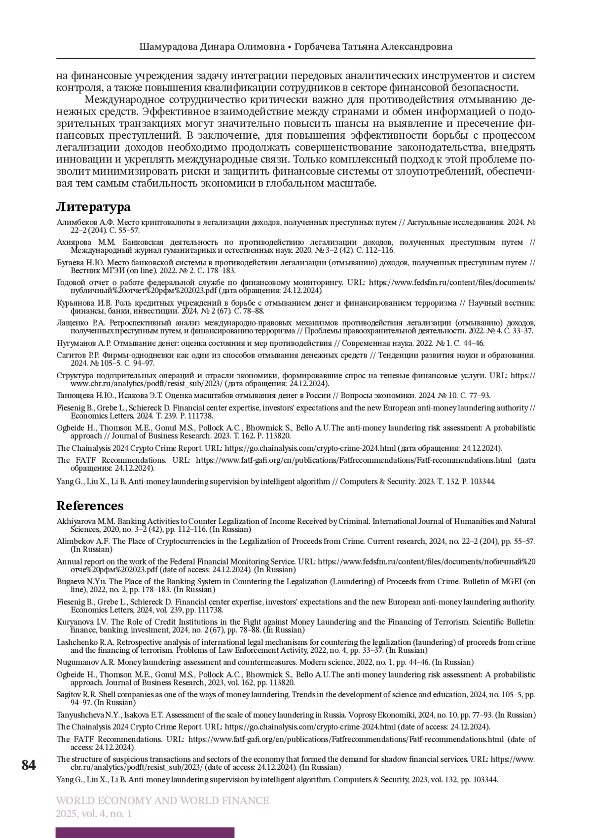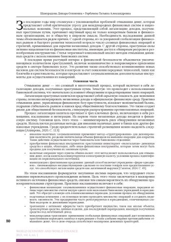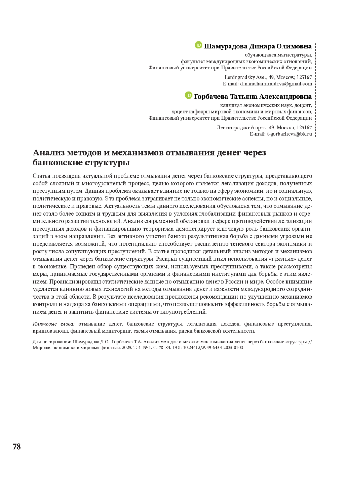 ШАМУРАДОВА Д. О., ГОРБАЧЕВА Т. А. АНАЛИЗ МЕТОДОВ И МЕХАНИЗМОВ ОТМЫВАНИЯ ДЕНЕГ ЧЕРЕЗ БАНКОВСКИЕ СТРУКТУРЫ // МИРОВАЯ ЭКОНОМИКА И МИРОВЫЕ ФИНАНСЫ. 2025. № 1, ТОМ 4
