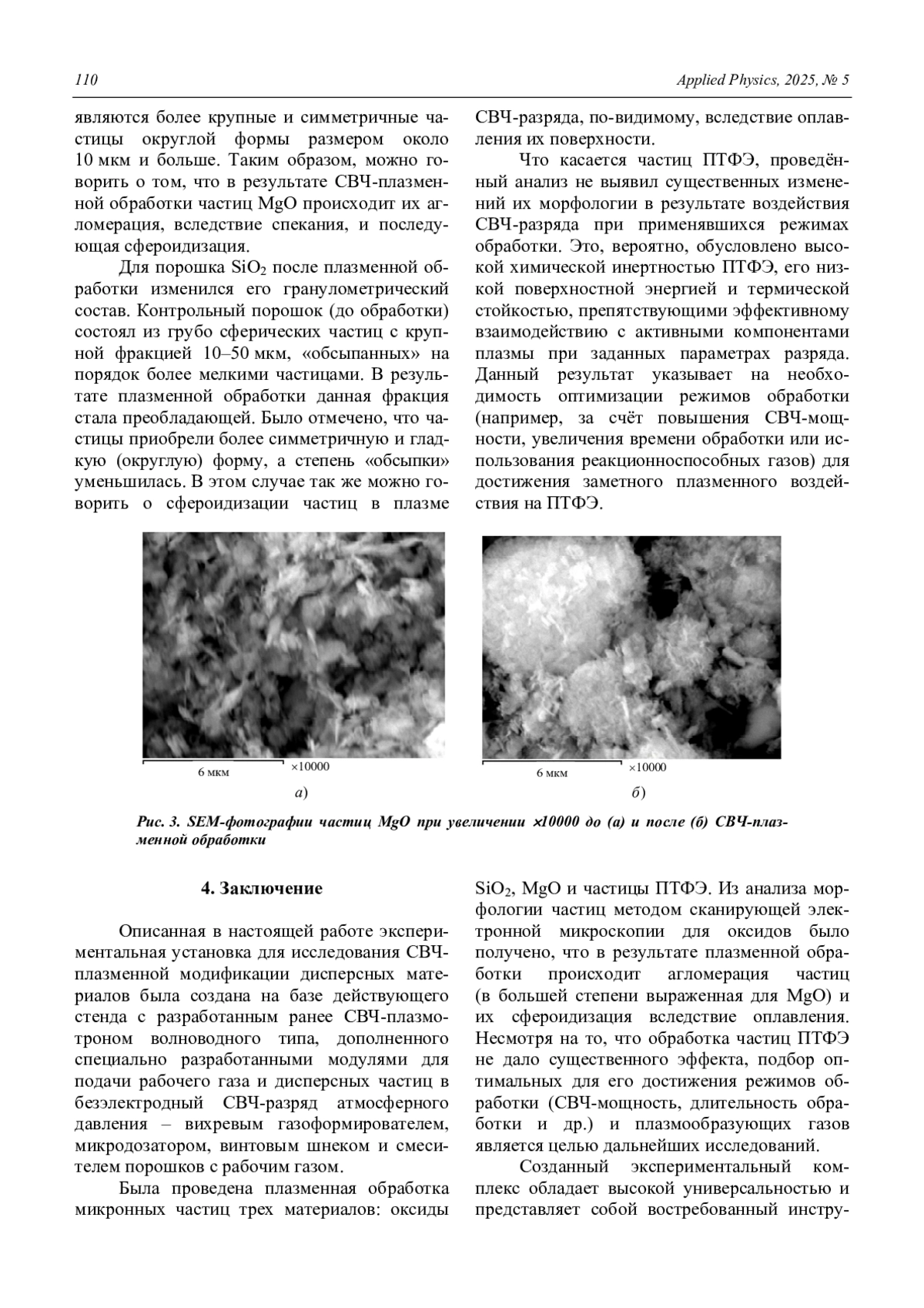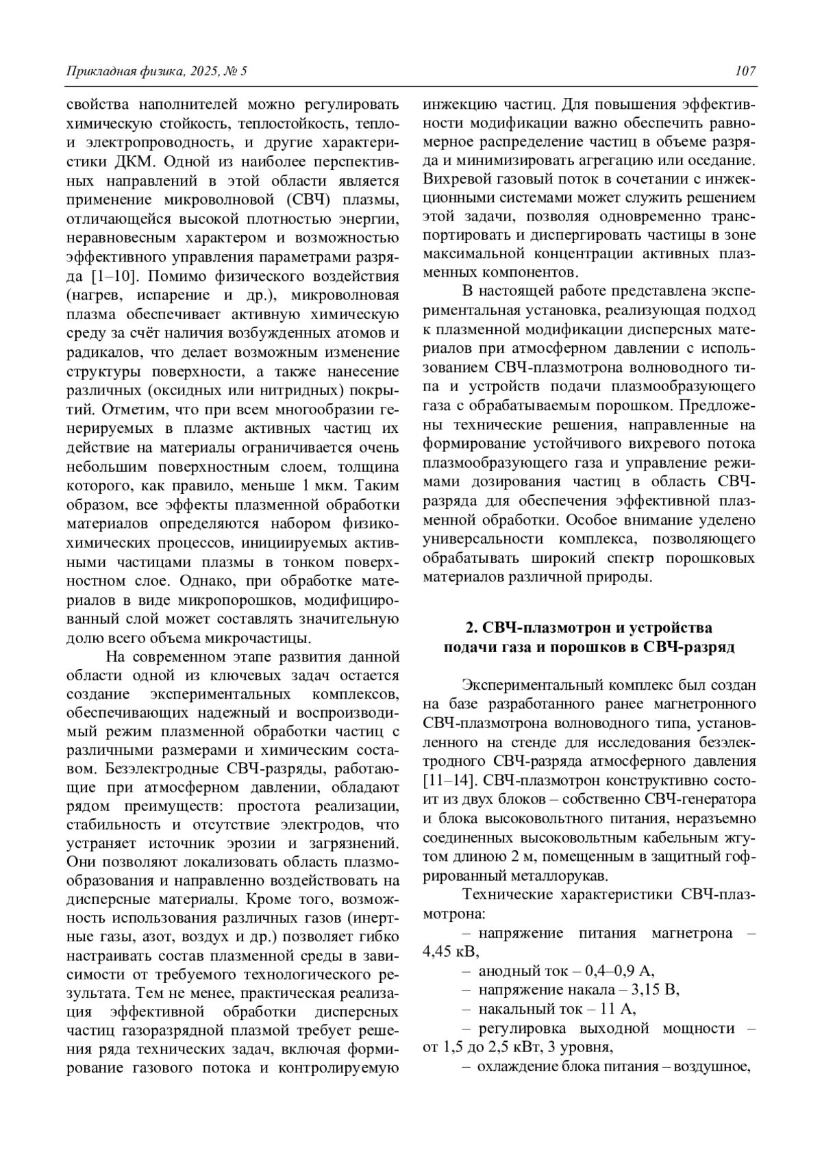 Представлена экспериментальная установка, созданная на базе СВЧ-плазмотрона волноводного типа, для исследования плазменной модификации дисперсных материалов (сыпучих порошков) в безэлектродном СВЧ-разряде атмосферного давления в газовом потоке. Разработаны устройства (модули установки) для формирования вихрево-го потока плазмообразующего газа и управляемой инжекции дисперсных частиц в СВЧ-разряд. Проведены предварительные эксперименты по обработке микрочастиц SiO2, MgO и политетрафторэтилена (ПТФЭ) в СВЧ-разряде в потоке аргона. Анализ частиц проводился методом сканирующей электронной микроскопии. На примере оксидов было показано, что СВЧ-плазменное воздействие может приводить к агломерации частиц и их сфероидизации. Созданный экспериментальный комплекс с использованием разнообразных рабочих газов предоставляет универсальные возможности для задач плазменной модификации дисперсных частиц в широком диапазоне размеров и материалов.