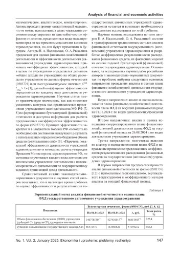 Статья посвящена актуальной теме - поиску наилучшего сочетания целей возможности государства и граждан в вопросах здравоохранения населения и обеспечения прав на получения медицинских услуг. Предметом исследования является совокупность теоретических, методологических и нормативных вопросов применения методов анализа финансовой отчетности в оценке финансово- хозяйственной деятельности государственного автономного учреждения здравоохранения. Цель исследования заключается в теоретическом и методологическом обосновании и трансформации традиционных методов анализа финансовой отчетности коммерческой организации к методам оценки финансово- хозяйственной деятельности государственного автономного учреждения. В статье представлены данные финансовой отчетности государственного автономного учреждения здравоохранения форма (0503721) и форма (0503737), проведен анализ финансовой отчетности и выявлены особенности формирования плана ФХД по объему финансового обеспечения (субсидий, средств), доходов и расходов по видам деятельности учреждения. Предложено, в оценку плана финансово- хозяйственной деятельности учреждения ввести - коэффициенты результативности расходования финансовых средств, с построением факторных моделей и методами расчета факторов по видам деятельности государственного автономного учреждения здравоохранения.