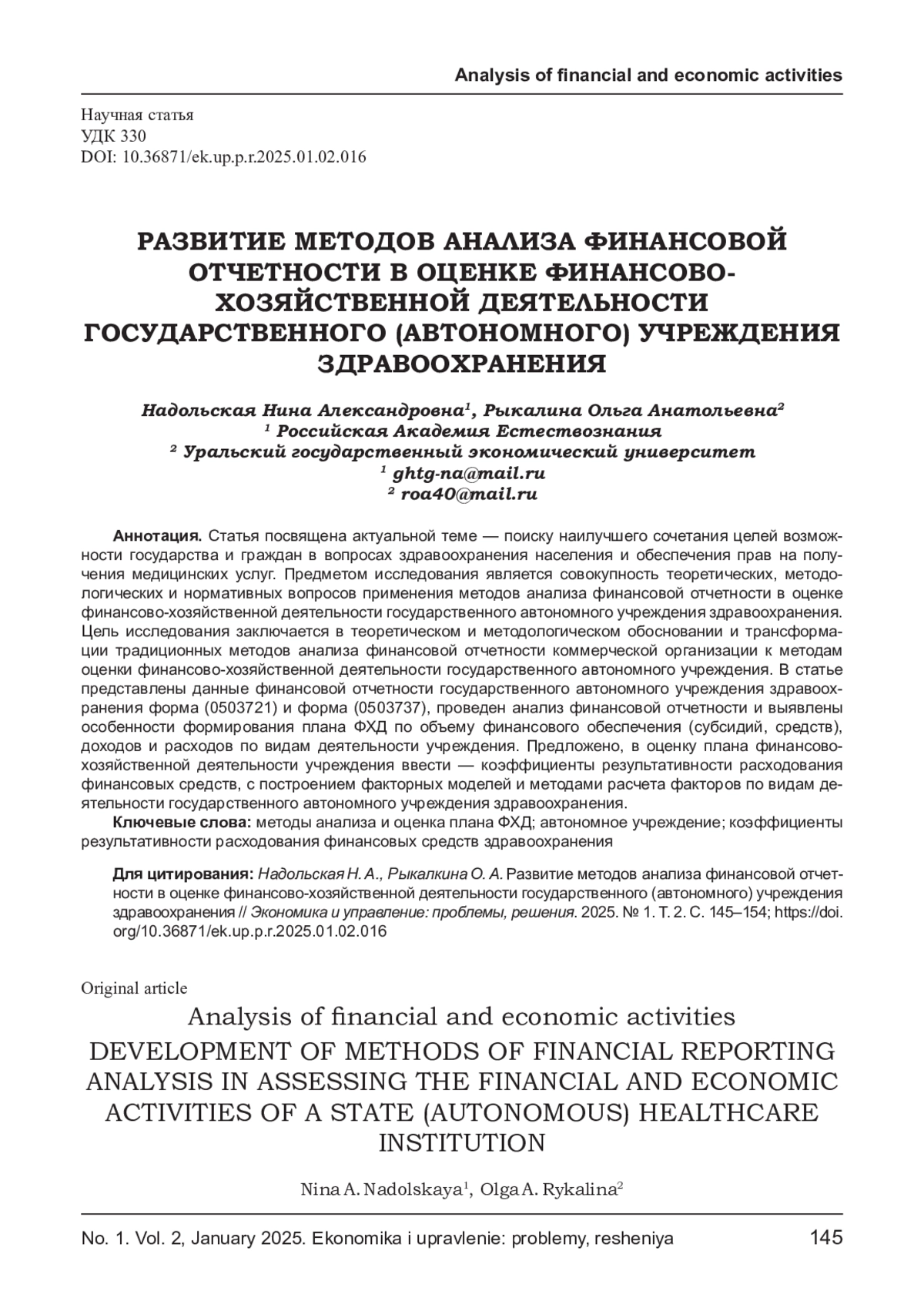 3. Надольская Н. А., Рыкалина О. А. Совершенствование факторных моделей доходов и расходов в оценке финансово-хозяйственной деятельности государственного автономного учреждения здравоохранения. Первый экономический журнал. - 2024. - № 9. - С. 79. EDN: CUBWLO