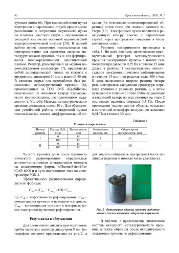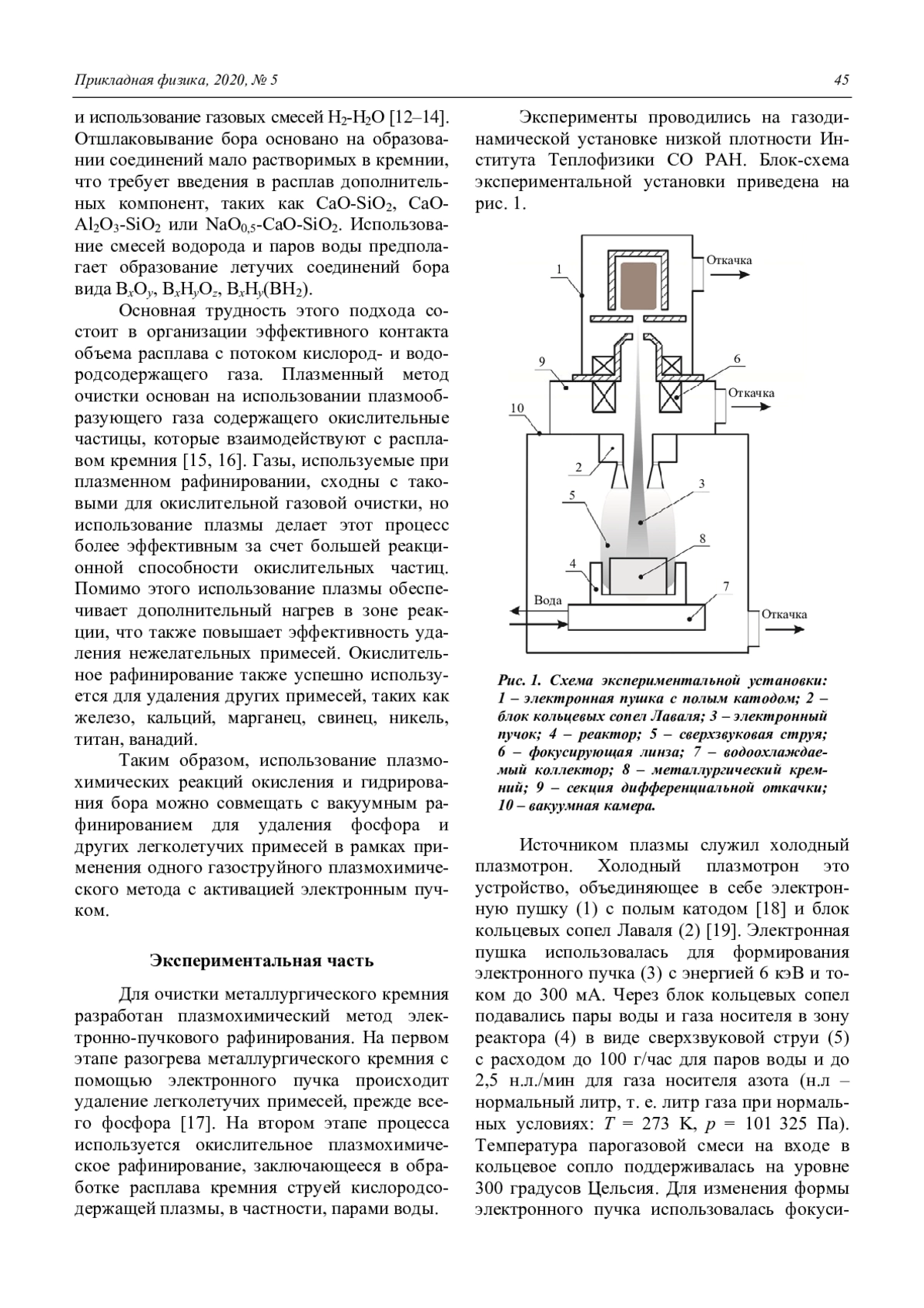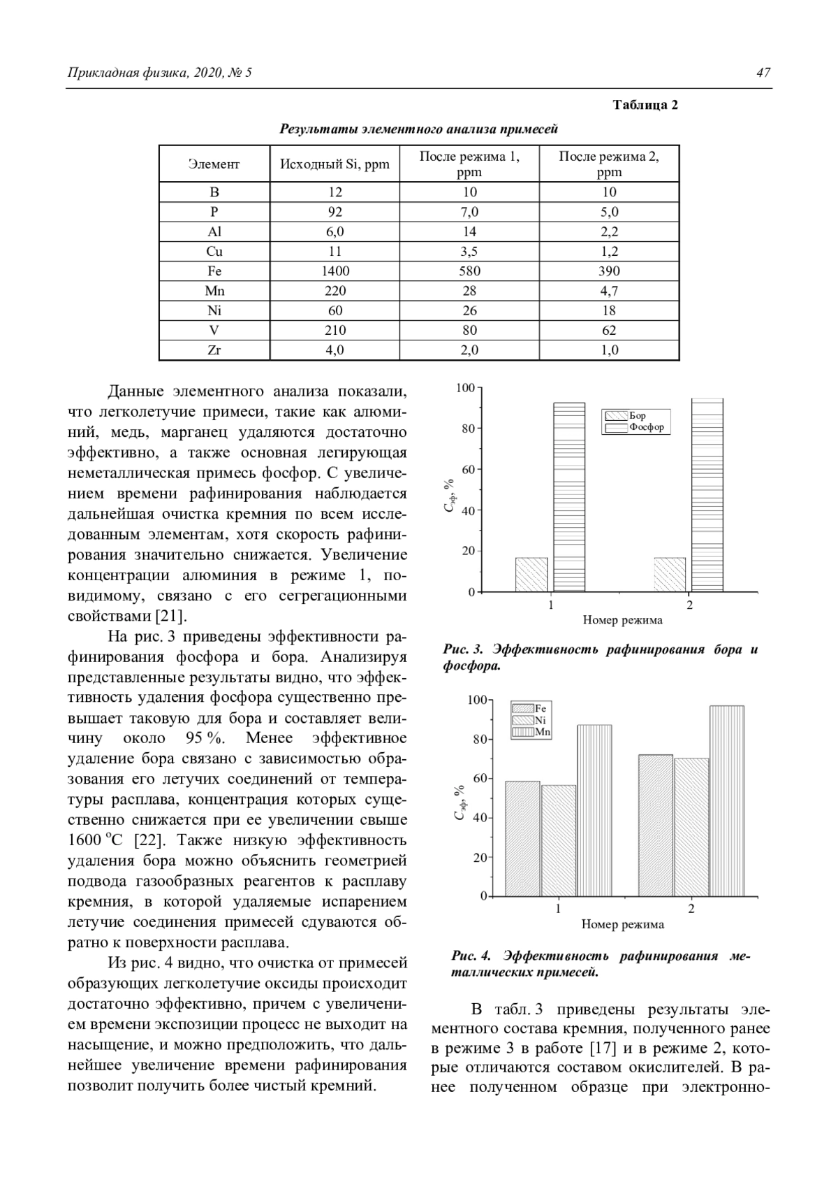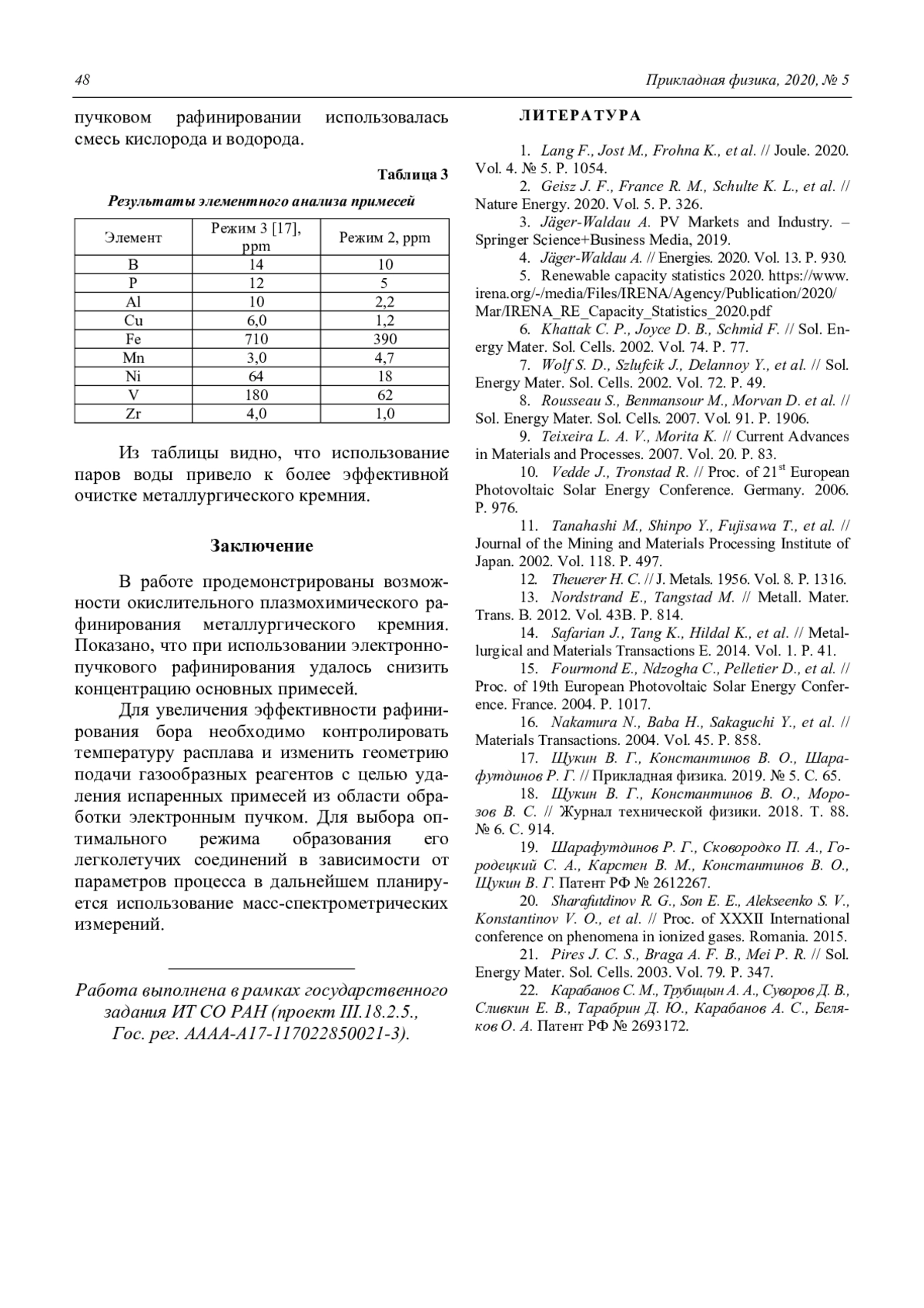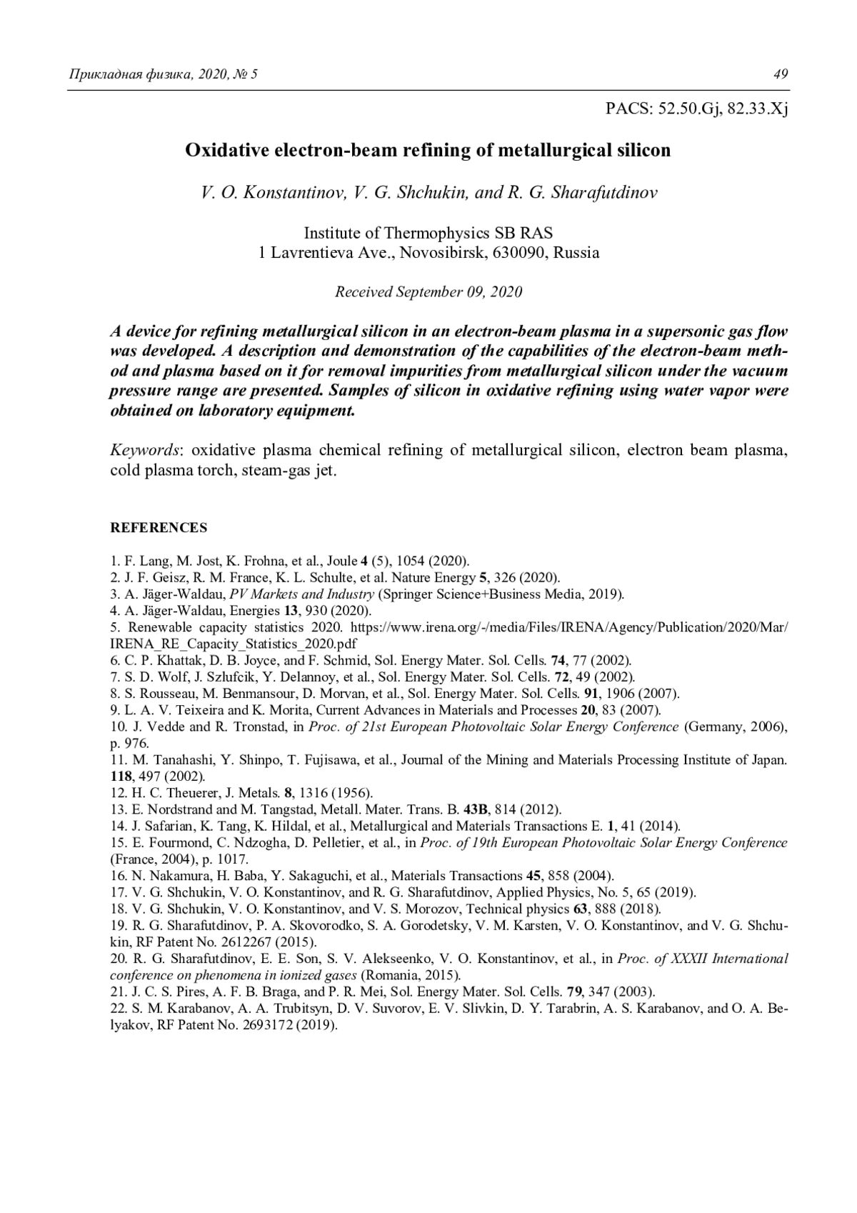 КОНСТАНТИНОВ В. О., ЩУКИН В. Г., ШАРАФУТДИНОВ Р. Г. ОКИСЛИТЕЛЬНОЕ ЭЛЕКТРОННО-ПУЧКОВОЕ РАФИНИРОВАНИЕ МЕТАЛЛУРГИЧЕСКОГО КРЕМНИЯ // ПРИКЛАДНАЯ ФИЗИКА. 2020. № 5