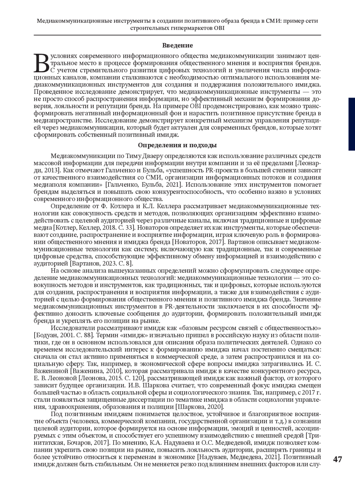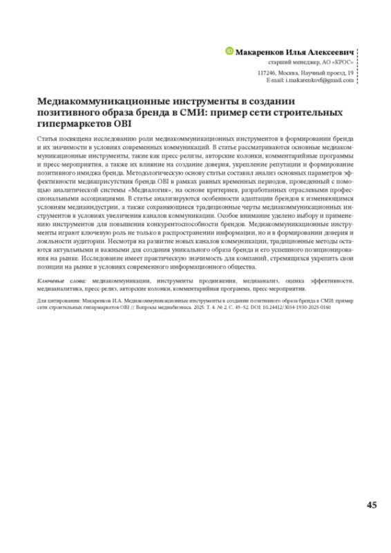 В условиях современного информационного общества медиакоммуникации занимают центральное место в процессе формирования общественного мнения и восприятия брендов. С учетом стремительного развития цифровых технологий и увеличения числа информационных каналов, компании сталкиваются с необходимостью оптимального использования медиакоммуникационных инструментов для создания и поддержания положительного имиджа. Проведенное исследование демонстрирует, что медиакоммуникационные инструменты — это не просто способ распространения информации, но эффективный механизм формирования доверия, лояльности и репутации бренда. На примере OBI продемонстрировано, как можно трансформировать негативный информационный фон и нарастить позитивное присутствие бренда в медиапространстве. Исследование демонстрирует конкретный механизм управления репутацией через медиакоммуникации, который будет актуален для современных брендов, которые хотят сформировать собственный позитивный имидж.