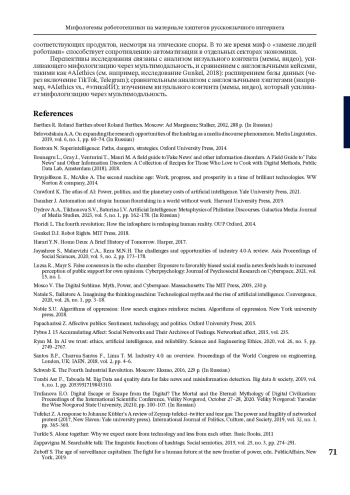 23. Trufanova E.O. Digital Escape or Escape from the Digital? The Mortal and the Eternal: Mythology of Digital Civilization: Proceedings of the International Scientific Conference, Veliky Novgorod, October 27-28, 2020. Veliky Novgorod: Yaroslav the Wise Novgorod State University, 20210, pp. 100-107. (In Russian).