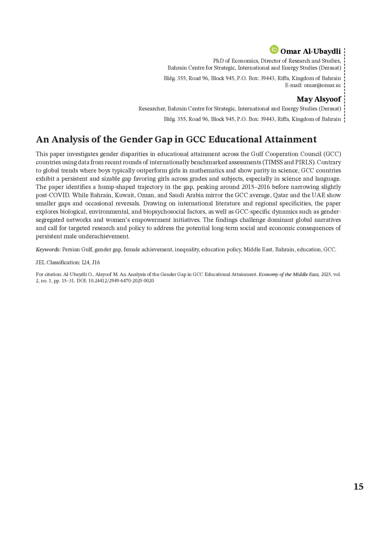The countries of the Gulf Cooperation Council (GCC) are all currently restructuring their economies with the goal of decreasing the importance of hydrocarbons to GDP and to state budgets, under the umbrella of national strategic documents known as “economic visions” (Beutel, 2021). The architects of these visions have correctly diagnosed two long-standing impediments to the development of non-hydrocarbon activity within the GCC economies: the need to reform and modernize the education systems (Mosly, 2022); and the need to increase female labor force participation (Young, 2016). Accordingly, the visions of all six countries explicitly state the importance of improving educational attainment and of empowering women to play a larger role in the economy.