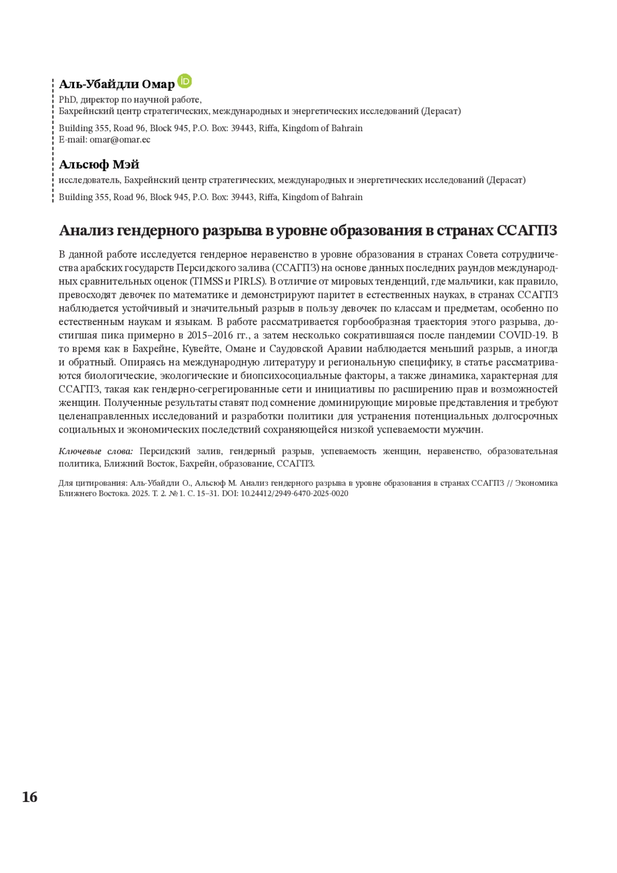 В данной работе исследуется гендерное неравенство в уровне образования в странах Совета сотрудничества арабских государств Персидского залива (ССАГПЗ) на основе данных последних раундов международных сравнительных оценок (TIMSS и PIRLS). В отличие от мировых тенденций, где мальчики, как правило, превосходят девочек по математике и демонстрируют паритет в естественных науках, в странах ССАГПЗ наблюдается устойчивый и значительный разрыв в пользу девочек по классам и предметам, особенно по естественным наукам и языкам. В работе рассматривается горбообразная траектория этого разрыва, достигшая пика примерно в 2015–2016 гг., а затем несколько сократившаяся после пандемии COVID-19. В то время как в Бахрейне, Кувейте, Омане и Саудовской Аравии наблюдается меньший разрыв, а иногда и обратный. Опираясь на международную литературу и региональную специфику, в статье рассматриваются биологические, экологические и биопсихосоциальные факторы, а также динамика, характерная для ССАГПЗ, такая как гендерно-сегрегированные сети и инициативы по расширению прав и возможностей женщин. Полученные результаты ставят под сомнение доминирующие мировые представления и требуют целенаправленных исследований и разработки политики для устранения потенциальных долгосрочных социальных и экономических последствий сохраняющейся низкой успеваемости мужчин.