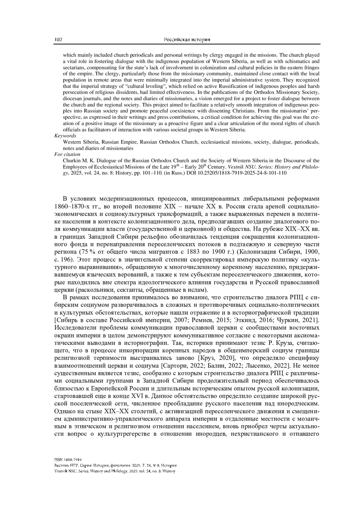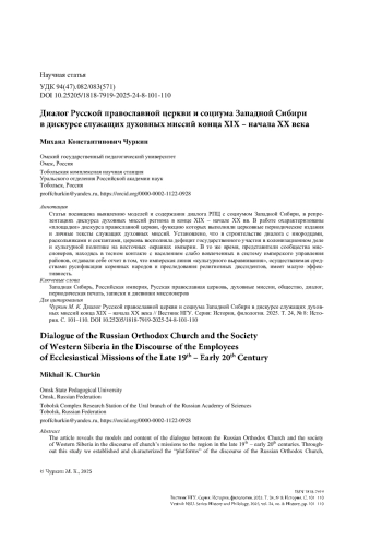 Статья посвящена выявлению моделей и содержания диалога РПЦ с социумом Западной Сибири, в репрезентациях дискурса духовных миссий региона в конце ХIХ – начале ХХ вв. В работе охарактеризованы «площадки» дискурса православной церкви, функцию которых выполняли церковные периодические издания и личные тексты служащих духовных миссий. Установлено, что в строительстве диалога с инородцами, раскольниками и сектантами, церковь восполняла дефицит государственного участия в колонизационном деле и культурной политике на восточных окраинах империи. В то же время, представители сообщества миссионеров, находясь в тесном контакте с населением слабо вовлеченных в систему имперского управления районов, отдавали себе отчет в том, что имперская линия «культурного выравнивания», осуществляемая средствами русификации коренных народов и преследования религиозных диссидентов, имеет малую эффективность.