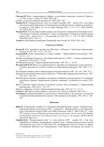 1. Балин М. А. Религиозная политика на восточных окраинах Российской империи: общественно-политический дискурс второй половины XIX - начала ХХ в. // Изв. Иркут. гос. унта. Серия: История. 2022. Т. 41. С. 31-40. https://doi.org/10.26516/2222-9124.2022.41.31