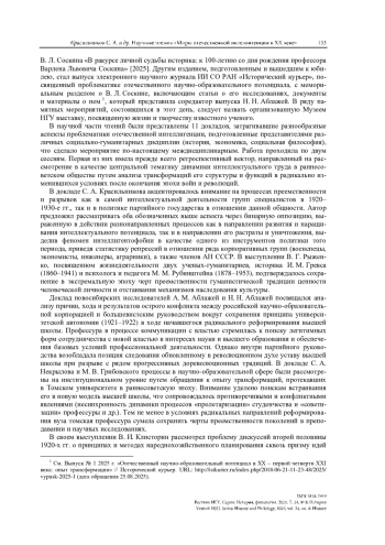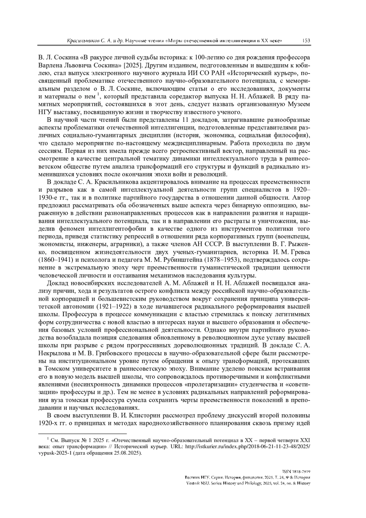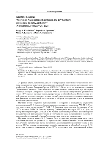 КРАСИЛЬНИКОВ С. А., ИГНАТЬЕВА Е. А., МАМОНТОВА Д. А., КОЖАЕВА А. А. НАУЧНЫЕ ЧТЕНИЯ «МИРЫ ОТЕЧЕСТВЕННОЙ ИНТЕЛЛИГЕНЦИИ В ХХ ВЕКЕ: ПРОФЕССИЯ, ОБЩЕСТВО, ВЛАСТЬ» (НОВОСИБИРСК, 26 ФЕВРАЛЯ 2025 Г.) // ВЕСТНИК НГУ. СЕРИЯ: ИСТОРИЯ, ФИЛОЛОГИЯ. 2025. ТОМ 24, № 8