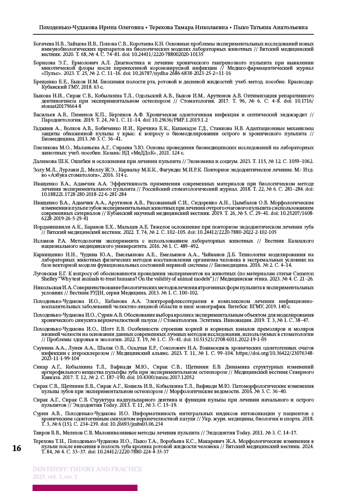 ПОХОДЕНЬКО-ЧУДАКОВА И. О., ТЕРЕХОВА Т. Н., ПЫКО Т. А. ОБОСНОВАНИЕ ВЫБОРА БИОЛОГИЧЕСКОГО ОБЪЕКТА ДЛЯ СОЗДАНИЯ ЭКСПЕРИМЕНТАЛЬНОЙ МОДЕЛИ ХРОНИЧЕСКОГО ПУЛЬПИТА // СТОМАТОЛОГИЯ: ТЕОРИЯ И ПРАКТИКА. 2025. № 1, ТОМ 3