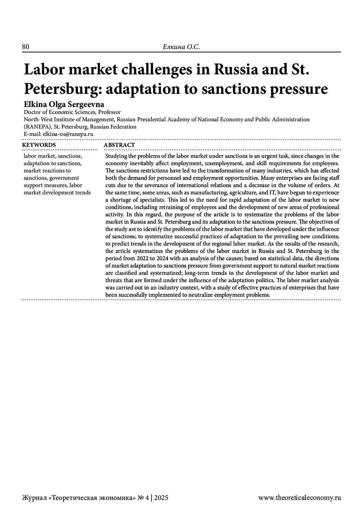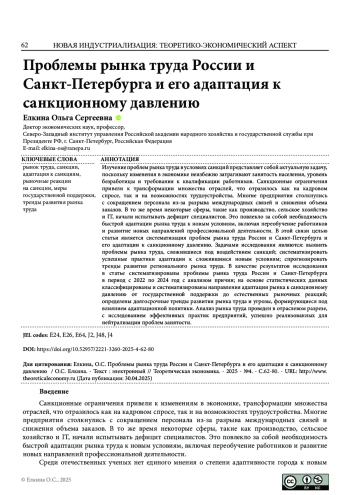Изучение проблем рынка труда в условиях санкций представляет собой актуальную задачу, поскольку изменения в экономике неизбежно затрагивают занятость населения, уровень безработицы и требования к квалификации работников. Санкционные ограничения привели к трансформации множества отраслей, что отразилось как на кадровом спросе, так и на возможностях трудоустройства. Многие предприятия столкнулись с сокращением персонала из-за разрыва международных связей и снижения объема заказов. В то же время некоторые сферы, такие как производство, сельское хозяйство и IT, начали испытывать дефицит специалистов. Это повлекло за собой необходимость быстрой адаптации рынка труда к новым условиям, включая переобучение работников и развитие новых направлений профессиональной деятельности. В этой связи целью статьи является систематизация проблем рынка труда России и Санкт-Петербурга и его адаптации к санкционному давлению. Задачами исследования являются: выявить проблемы рынка труда, сложившиеся под воздействием санкций; систематизировать успешные практики адаптации к сложившимся новым условиям; спрогнозировать тренды развития регионального рынка труда. В качестве результатов исследования в статье систематизированы проблемы рынка труда России и Санкт-Петербурга в период с 2022 по 2024 год с анализом причин; на основе статистических данных классифицированы и систематизированы направления адаптации рынка к санкционному давлению от государственной поддержки до естественных рыночных реакций; определены долгосрочные тренды развития рынка труда и угрозы, формирующиеся под влиянием адаптационной политики. Анализ рынка труда проведен в отраслевом разрезе, с исследованием эффективных практик предприятий, успешно реализованных для нейтрализации проблем занятости.