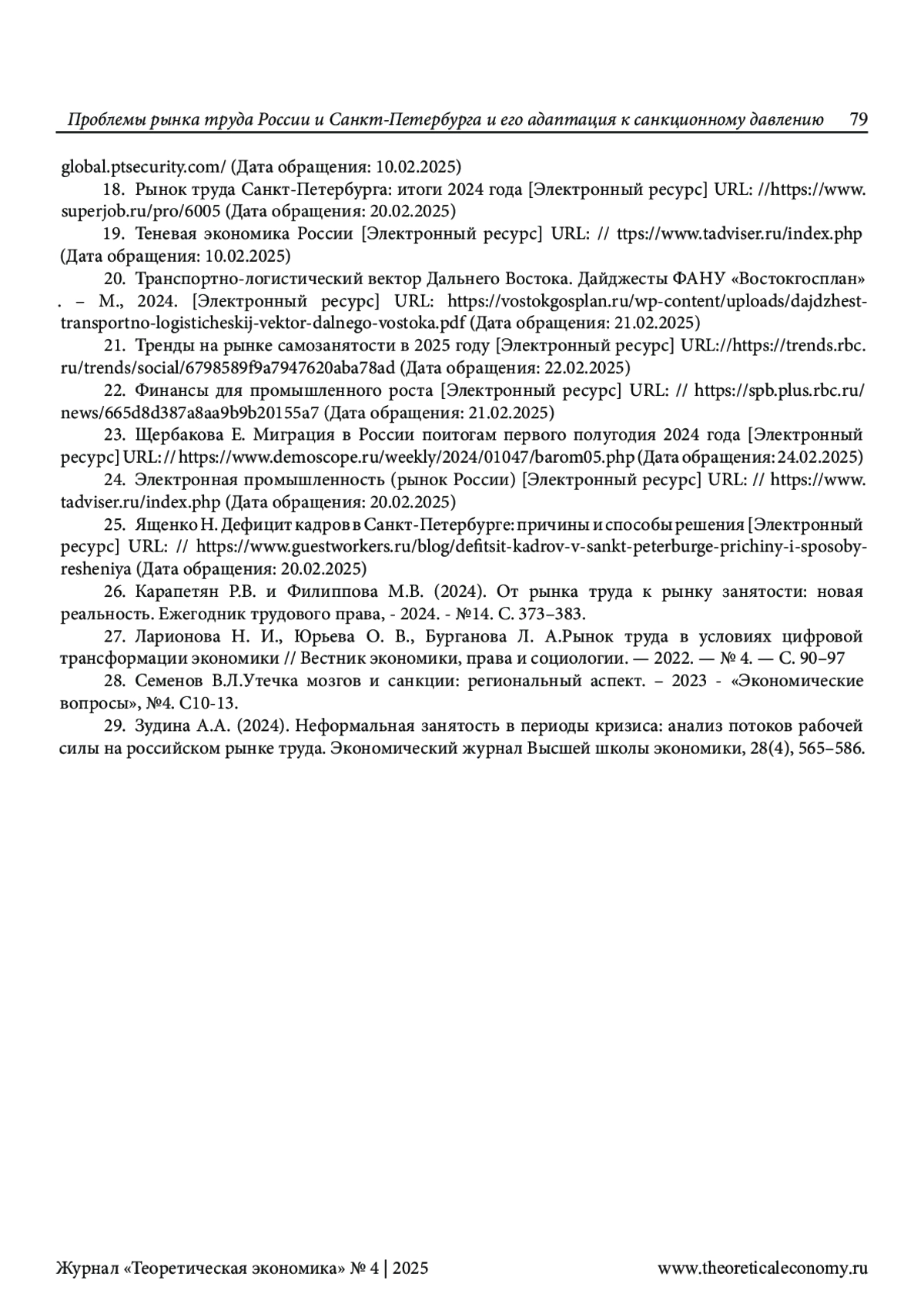 25. Ященко Н. Дефицит кадров в Санкт-Петербурге: причины и способы решения [Электронный ресурс] URL: // https://www.guestworkers.ru/blog/defitsit-kadrov-v-sankt-peterburge-prichiny-i-sposoby-resheniya (Дата обращения: 20.02.2025).