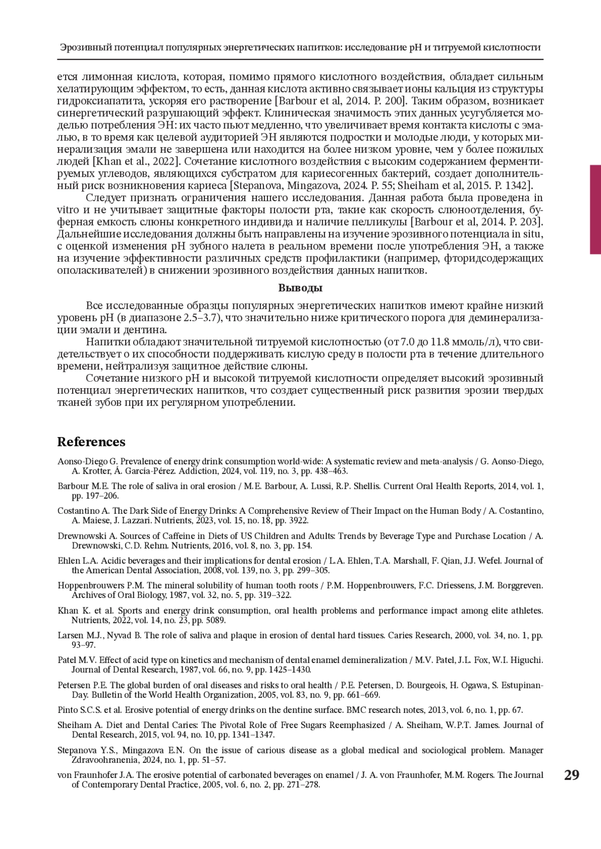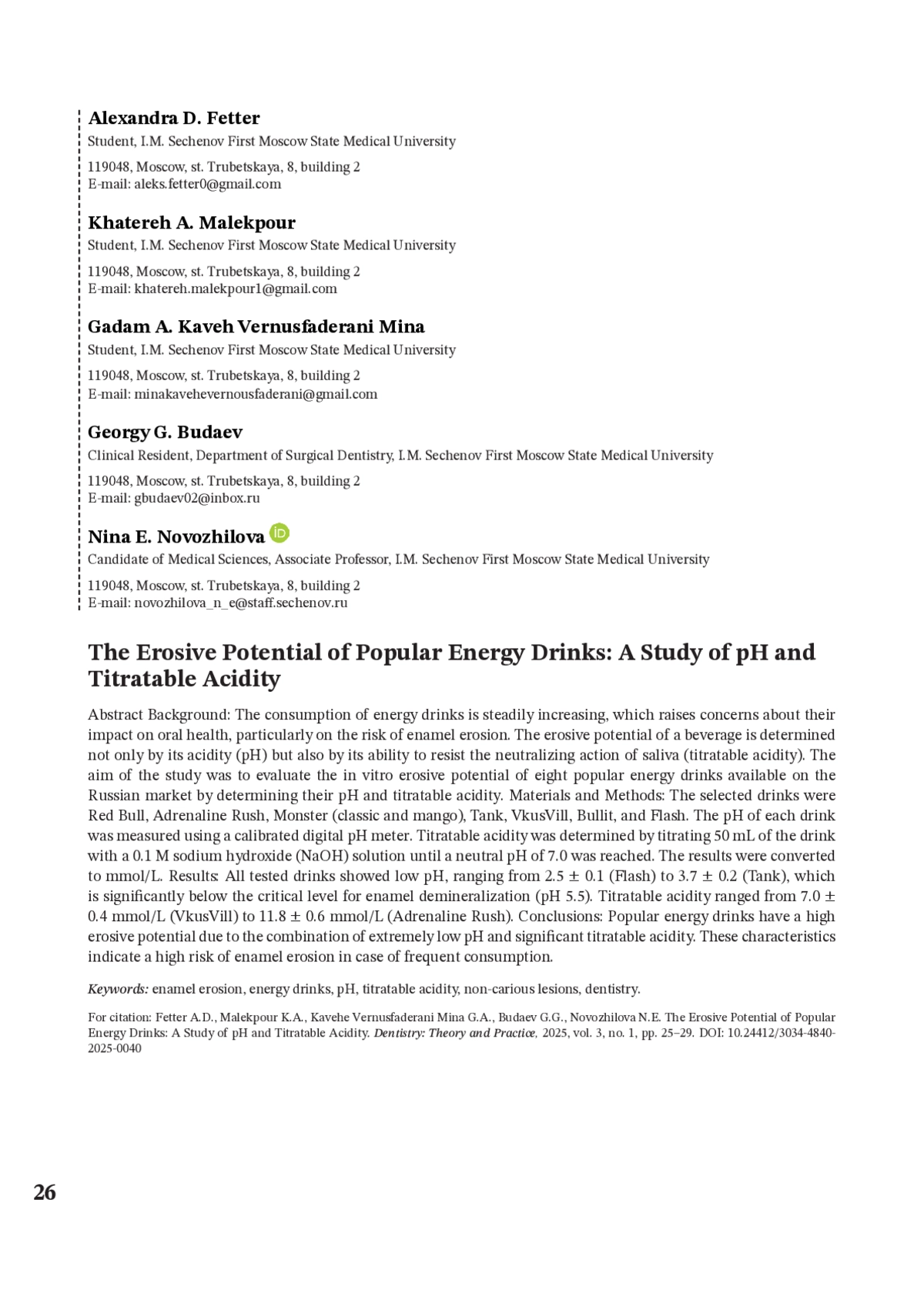 Актуальность: Потребление энергетических напитков неуклонно растет, что вызывает обеспокоенность относительно их влияния на здоровье полости рта, в частности на риск развития эрозии твердых тканей зубов. Эрозивный потенциал напитка определяется не только его кислотностью (pH), но и его способностью противостоять нейтрализующему действию слюны, то есть титруемой кислотностью. Целью настоящего исследования было оценить in vitro эрозивный потенциал восьми популярных на российском рынке энергетических напитков путем определения уровня их водородного показателя и титруемой кислотности. Материалы и методы: Для исследования были отобраны напитки: Red Bull, Adrenaline Rush, Monster (Classic и Mango), Tank, VkusVill, Bullit и Flash. Уровень pH каждого напитка измеряли с помощью калиброванного цифрового pH-метра. Титруемую кислотность определяли путем титрования 50 мл напитка 0.1 M раствором гидроксида натрия (NaOH) до достижения нейтрального pH 7.0. Результаты пересчитывали в ммоль/л. Результаты: Все исследованные напитки продемонстрировали низкий уровень pH, варьирующийся от 2.5 ± 0.1 (Flash) до 3.7 ± 0.2 (Tank), что значительно ниже критического уровня для деминерализации эмали (pH 5.5). Титруемая кислотность находилась в диапазоне от 7.0 ± 0.4 ммоль/л (VkusVill) до 11.8 ± 0.6 ммоль/л (Adrenaline Rush). Выводы: Популярные энергетические напитки обладают высоким эрозивным потенциалом из-за сочетания крайне низкой кислотности и значительной титруемой кислотности. Эти характеристики указывают на высокий риск развития эрозии эмали при их частом употреблении.