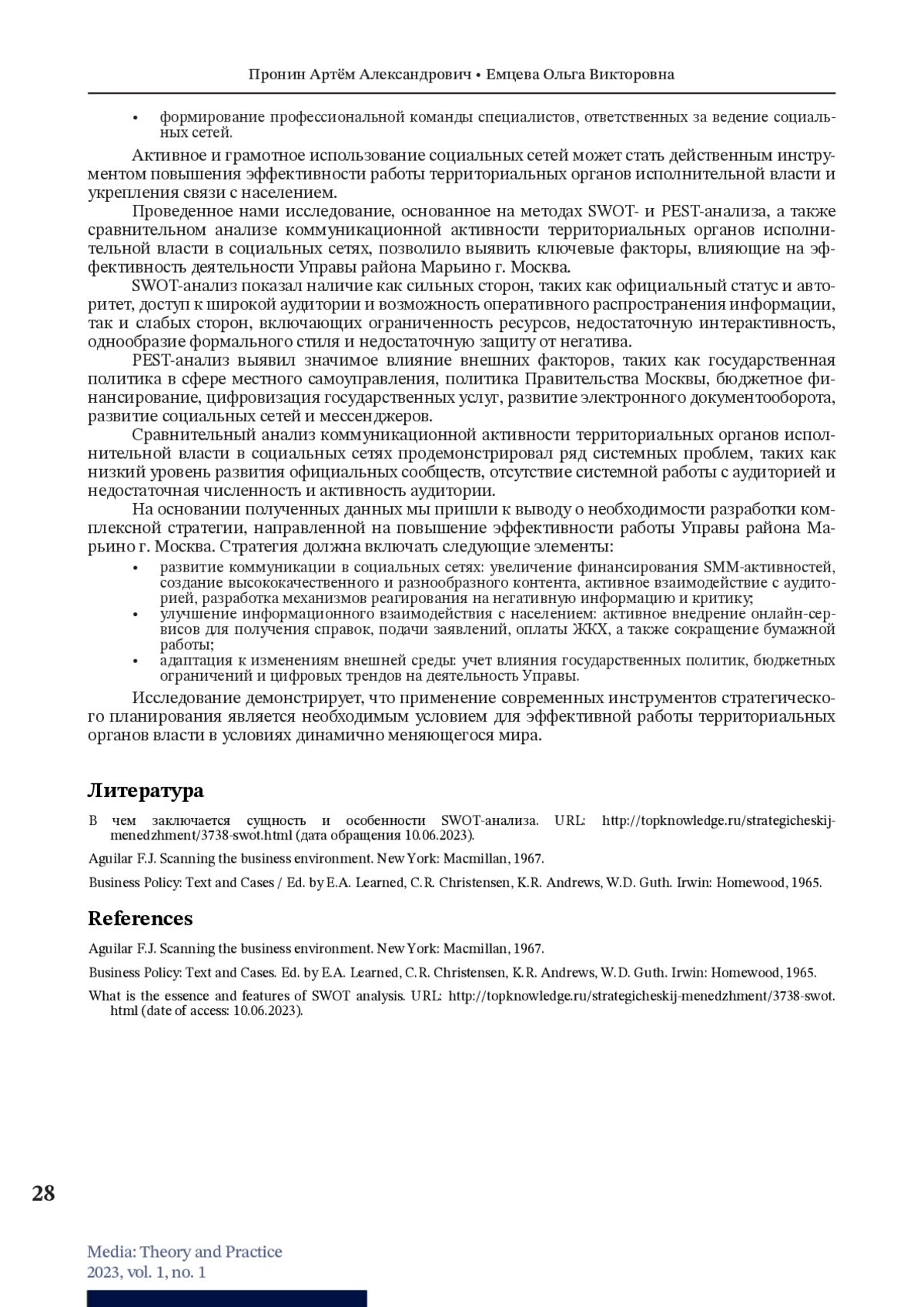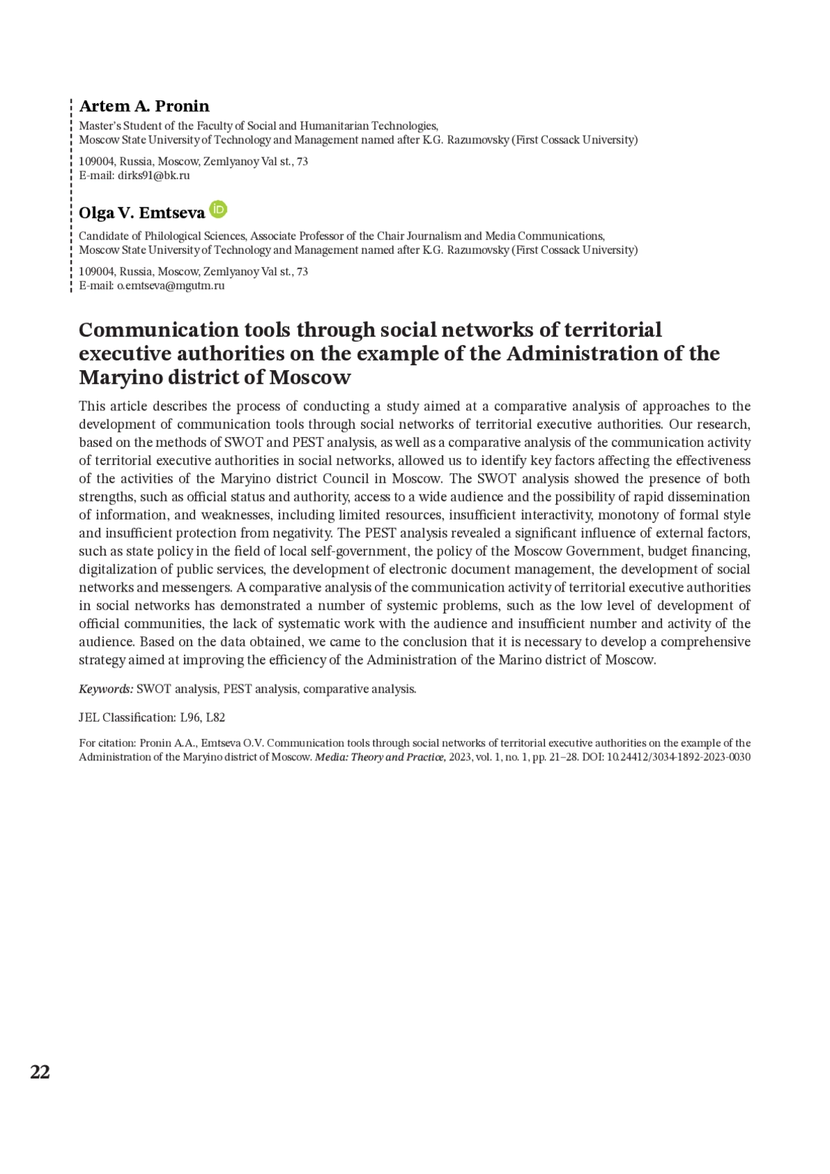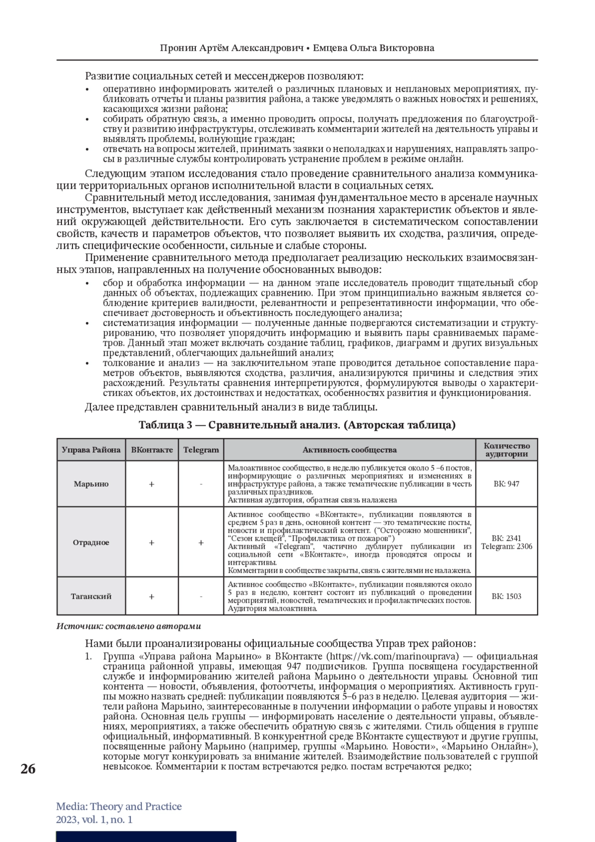 ПРОНИН А. А., ЕМЦЕВА О. В. ИНСТРУМЕНТЫ КОММУНИКАЦИИ ПОСРЕДСТВОМ СОЦИАЛЬНЫХ СЕТЕЙ ТЕРРИТОРИАЛЬНЫХ ОРГАНОВ ИСПОЛНИТЕЛЬНОЙ ВЛАСТИ НА ПРИМЕРЕ УПРАВЫ РАЙОНА МАРЬИНО МОСКВЫ // МЕДИА ТЕОРИЯ И ПРАКТИКА. 2023. № 1, ТОМ 1