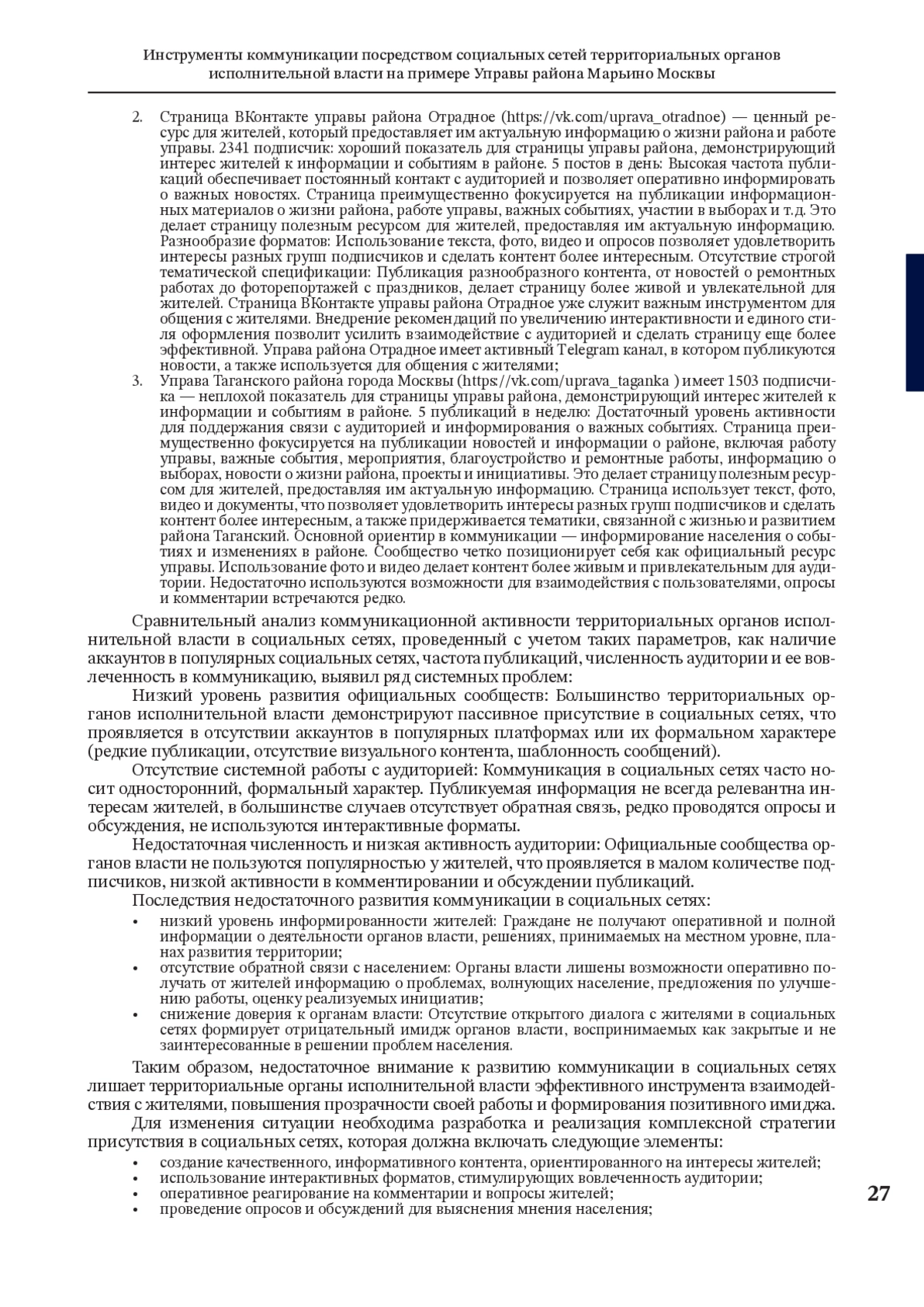 Статья: Инструменты коммуникации посредством социальных сетей территориальных органов исполнительной власти на примере Управы района Марьино Москвы (2023)