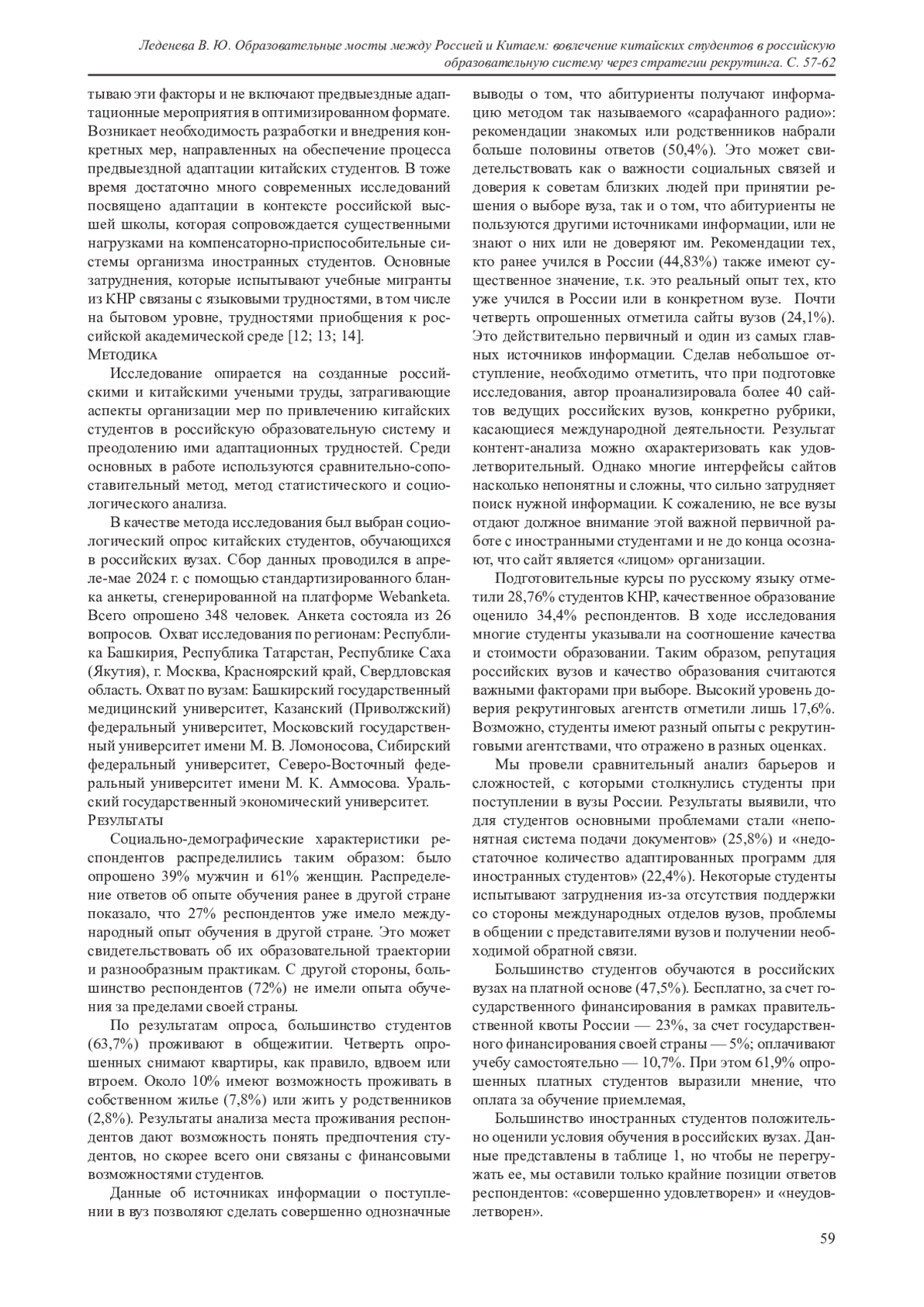В статье рассматриваются стратегии рекрутинга китайских студентов в российские образовательные учреждения. Основной целью работы является анализ существующих подходов к привлечению иностранных студентов и выявление эффективных практик, способствующих успешной адаптации китайских студентов в российскую образовательную систему. Методология работы включает комплексный анализ сравнительно-сопоставительных исследований действующих рекрутинговых программ, анализ статистических данных, анализ данных социологического исследования, проведенного в вузах России в апреле-мае 2024 г. (анкетный опрос китайских студентов, обучающихся в российских вузах). Результаты исследования выявили ключевые факторы, влияющие на выбор учебного заведения, такие как качество образования, репутация университета, наличие подготовительных курсов, программы поддержки и другие. Основным выводом является то, что для успешного привлечения китайских студентов необходимо адаптировать рекрутинговые стратегии, учитывая культурные и экономические особенности китайских студентов, их уникальные образовательные запросы и ожидания. Автором предложены разнообразные подходы к рекрутингу: эффективные целевые информационные кампании, демонстрация примеров успешных выпускников, организация ознакомительных поездок и вебинаров. Рекомендуется дальнейшее изучение и внедрение новых технологий в процессы рекрутинга для расширения международного сотрудничества и улучшения качества образовательных услуг.