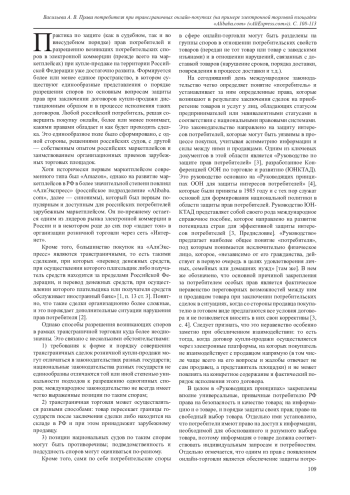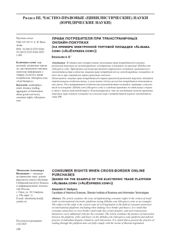 В статье рассмотрен вопрос реализации прав потребителей в рамках розничной торговли на международных электронных площадках на примере Alibaba. com (Aliexpress. com). Предметом изучения выступает современное состояние гражданского законодательства в области защиты прав потребителей на международных площадках (в том числе при совершении трансграничных покупок).