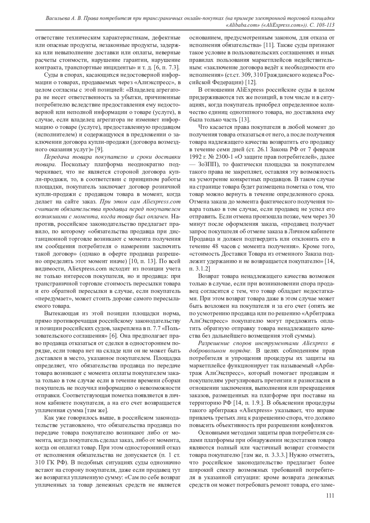 Отмечается, защита прав потребителей в трансграничной розничной торговле обладает определенными особенностями, а сами такие сделки несут для потребителя дополнительные риски. Рассматриваются особенности взаимодействия площадки, продавца и покупателя на площадке Alibaba. com (Aliexpress. com) и судебная практика по отдельным спорам в связи с таким взаимодействием. Констатируется, что на настоящий момент практика торговли через данную площадку не в полной мере соответствует нормам законодательства РФ.