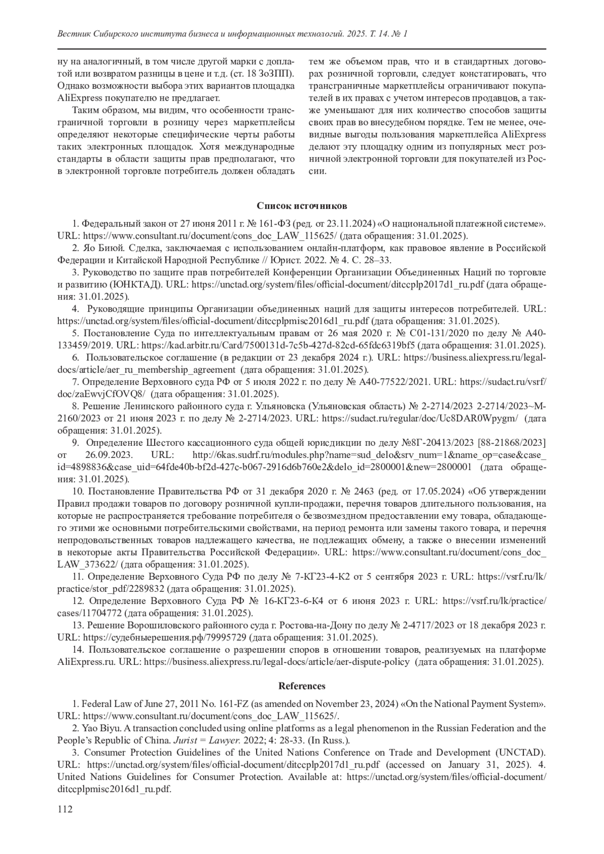 14. Пользовательское соглашение о разрешении споров в отношении товаров, реализуемых на платформе AliExpress.ru. URL: https://business.aliexpress.ru/legal-docs/article/aer-dispute-policy (дата обращения: 31.01.2025).
