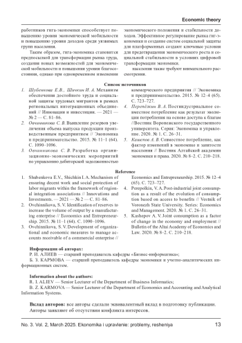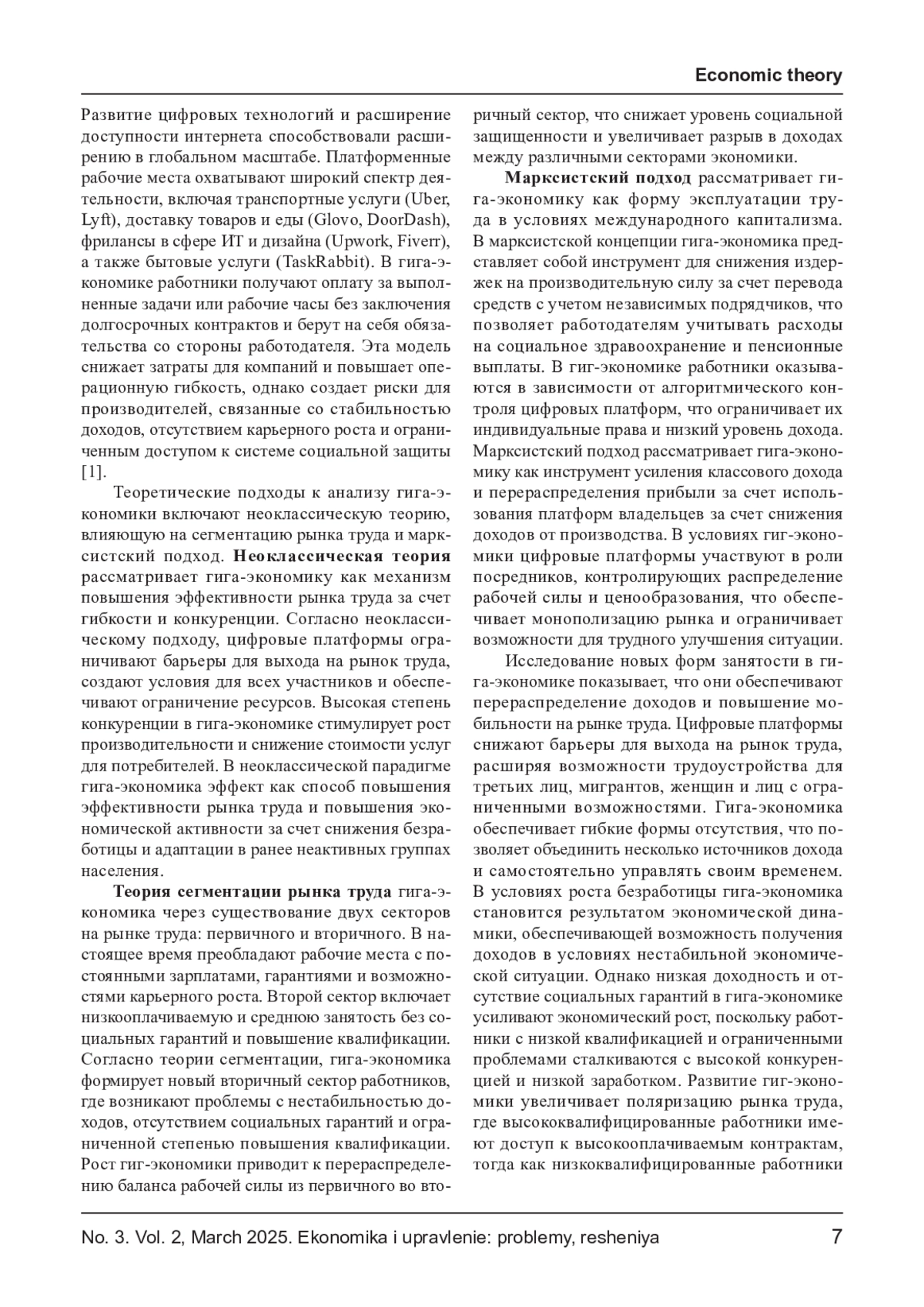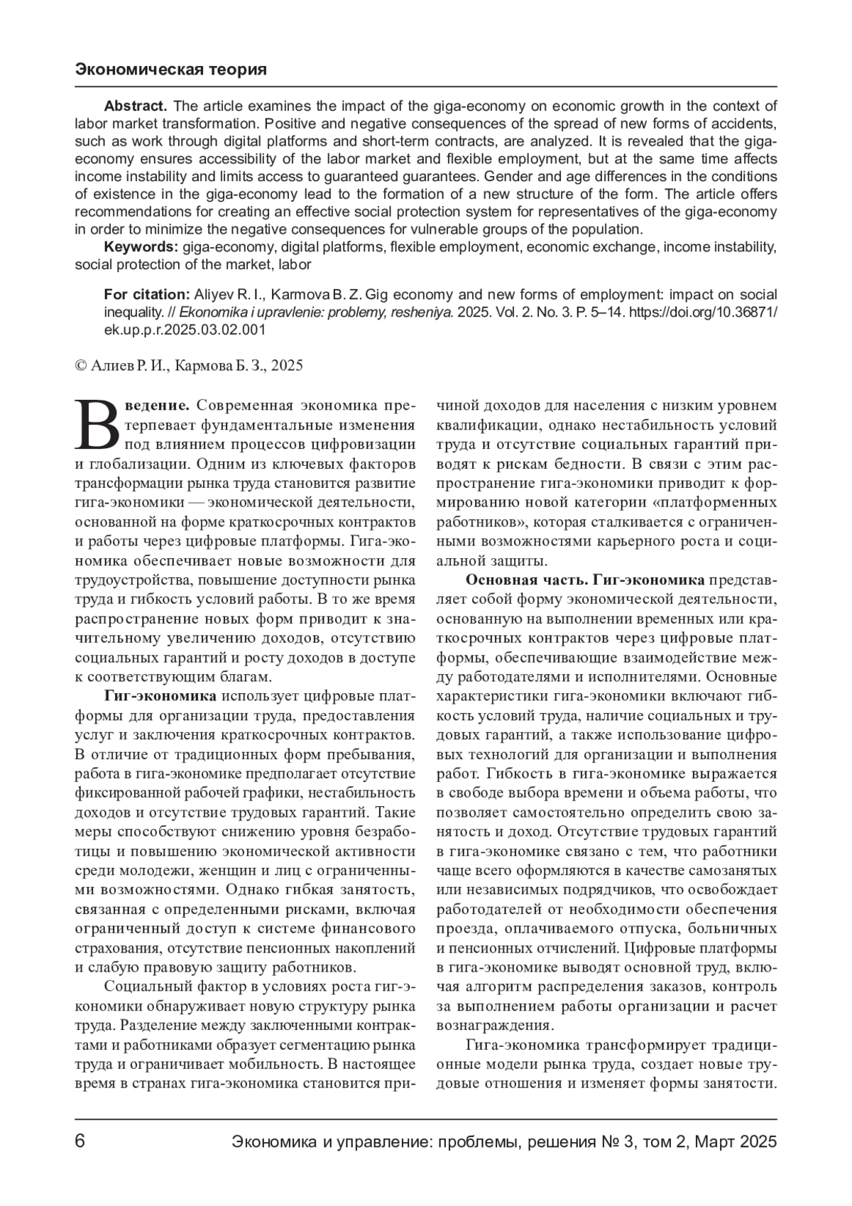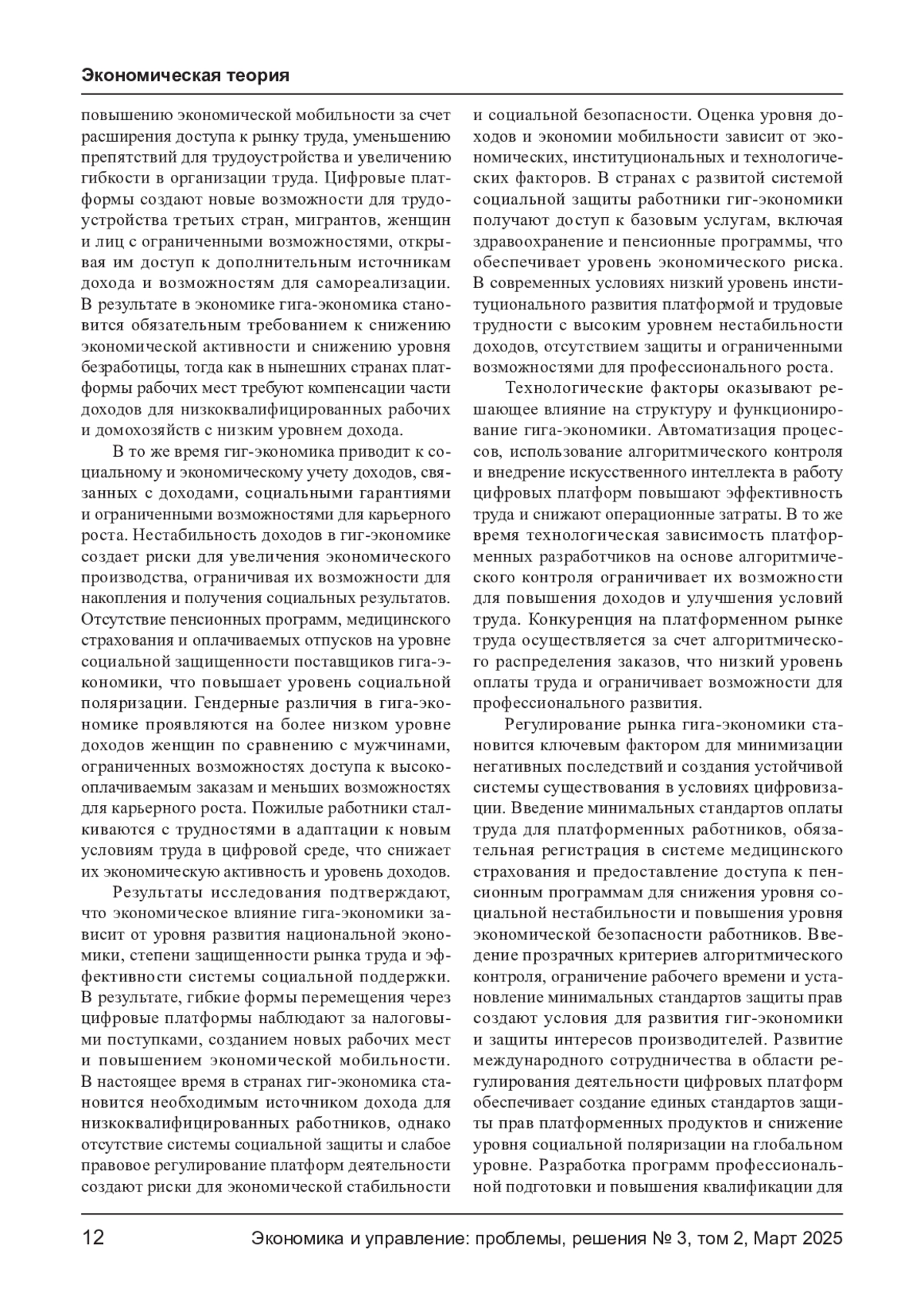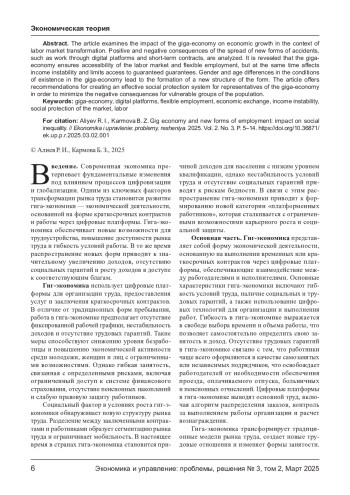В статье исследуется влияние гига-экономики на экономический рост в условиях трансформации рынка труда. Проанализированы позитивные и негативные последствия распространения новых форм аварий, таких как работа через цифровые платформы и краткосрочные контракты. Выявлено, что гига-экономика обеспечивает обеспечение доступности рынка труда и гибкой занятости, однако одновременно влияет на нестабильность доходов и ограничивает доступ к гарантированным гарантиям. Гендерные и возрастные различия в условиях существования в гига-экономике приводят к формированию новой структуры формы. В статье предложены рекомендации по созданию эффективной системы социальной защиты для представителей гиг-экономики с целью минимизации негативных последствий для уязвимых групп населения.