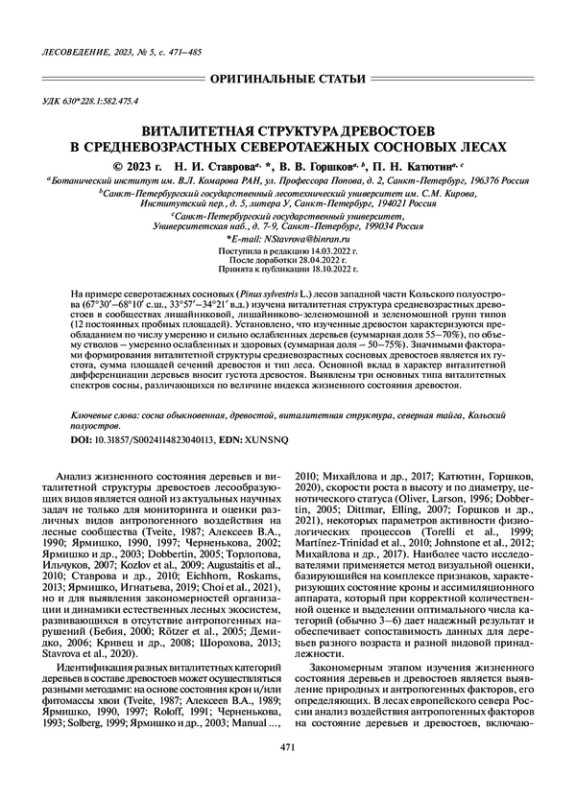 13. Катютин П.Н., Горшков В.В. Жизненное состояние, скорость роста и надземная фитомасса Pinus sylvestris (Pinaceae) в средневозрастных северотаежных лесах // Раститительные ресурсы. 2020. Т. 56. № 2. С. 99–111. EDN: OVYMKS