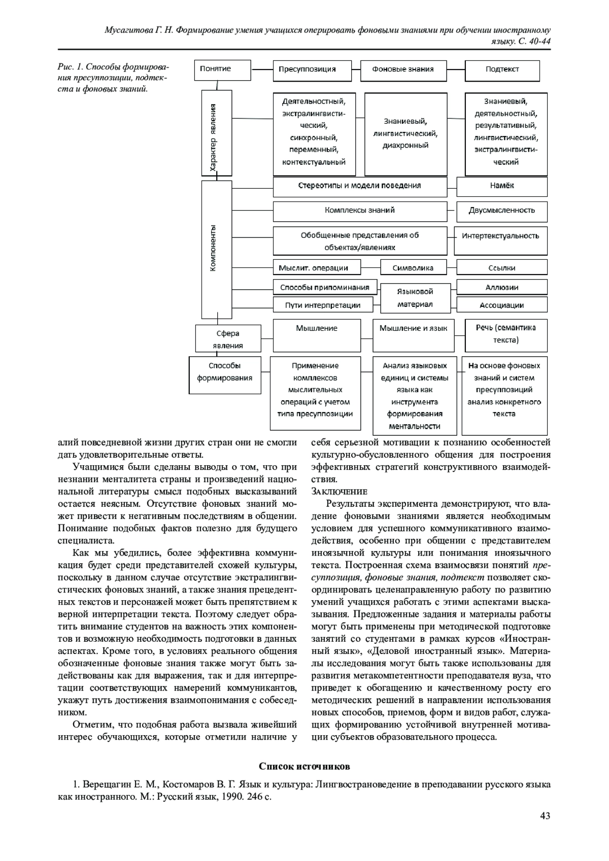 В статье описаны сущность и механизмы формирования фоновых знаний, обозначена роль этих видов знания в формировании умений выявлять пресуппозицию и обнаруживать подтекст высказывания. Цель работы — проанализировать роль фоновых знаний в успешном формировании языковых, культурных и коммуникативных компетенций учащихся, разграничить понятия «пресуппозиция», «подтекст» и «фоновые знания» и определить их логические взаимосвязи. Задачи статьи — на основе установленных между понятиями взаимосвязей определить способы формирования у учащихся фоновых знаний, умений выявлять пресуппозицию высказывания и понимать его подтекст; рассмотреть взаимосвязь между наличием фоновых знаний и успешностью интерпретации иноязычного сообщения. К используемым методам относятся анализ научной литературы, системный метод, абстрагирование, конкретизация. Научная новизна исследования заключается в построении схемы, отражающей общее и специфичное между понятиями «пресуппозиция», «фоновые знания» и «подтекст» по их компонентам, характеру и сфере бытования, а также в указании роли фоновых знаний в формировании умений выявления пресуппозиций и распознавания подтекста высказывания у учащихся. Определены способы обучения студентов выявлению комплекса пресуппозиций и интерпретации подтекста высказывания. Предложены задания для развития этих умений и контроля их сформированности. Полученные результаты могут быть применены при методической подготовке занятий со студентами в рамках курсов «Иностранный язык», «Деловой иностранный язык». Материалы исследования могут быть также использованы для развития метакомпетентности преподавателя вуза, что приведет к обогащению и качественному росту его методических решений в направлении использования новых способов, приемов, форм и видов работ, служащих формированию устойчивой внутренней мотивации субъектов образовательного процесса.