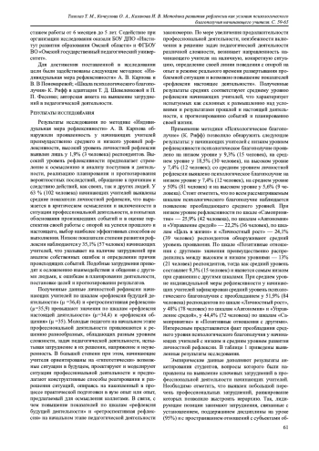 Применение методики «Психологическое благополучие» (К. Рифф) позволило обнаружить следующие результаты: у начинающих учителей с низким уровнем рефлексивности психологическое благополучие проявлено на низком уровне у 9,3% (15 человек), на среднем уровне у 18,5% (30 человек), на высоком уровне у 7,4% (12 человек); со средним уровнем личностной рефлексии выявлено психологическое благополучие на низком уровне у 7,4% (12 человек), на среднем уровне у 50% (81 человек) и на высоком уровне у 5,6% (9 человека).