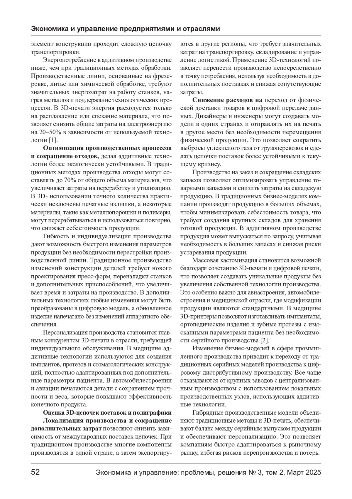 Развитие аддитивных технологий (3D-печати) оказывает влияние на промышленное производство, создавая новые возможности для снижения затрат, оптимизации процессов и повышения эффективности. Внедрение 3D-печати позволяет сократить расходы на материалы, логистику и доставку продукции, а также сократить сроки производства. В отличие от традиционных методов, аддитивное производство дает возможность создания сложных геометрических форм с потрясающими отходами, что повышает экологическую устойчивость производства. В статье рассматривается влияние преимуществ аддитивных технологий, их влияние на цепочки поставок, а также особенности применения в авиационно- космической, автомобильной, медицинской и строительной отраслях. Анализируются затраты на производство, сравниваются традиционные и цифровые методы производства, выявляются стандарты и ограничения массового развития 3D-печати в промышленности.