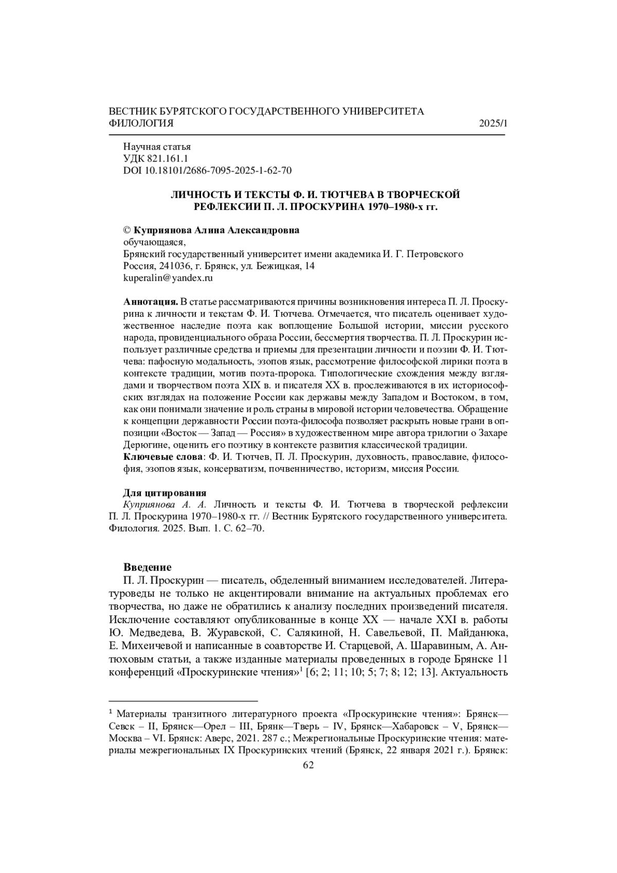 2. Журавская В. И. Природа и человек в прозе П. Л. Проскурина // Вестник Дальневосточной государственной научной библиотеки. 2017. № 1(74). С. 16-34. Текст: непосредственный. EDN: YLXRUJ